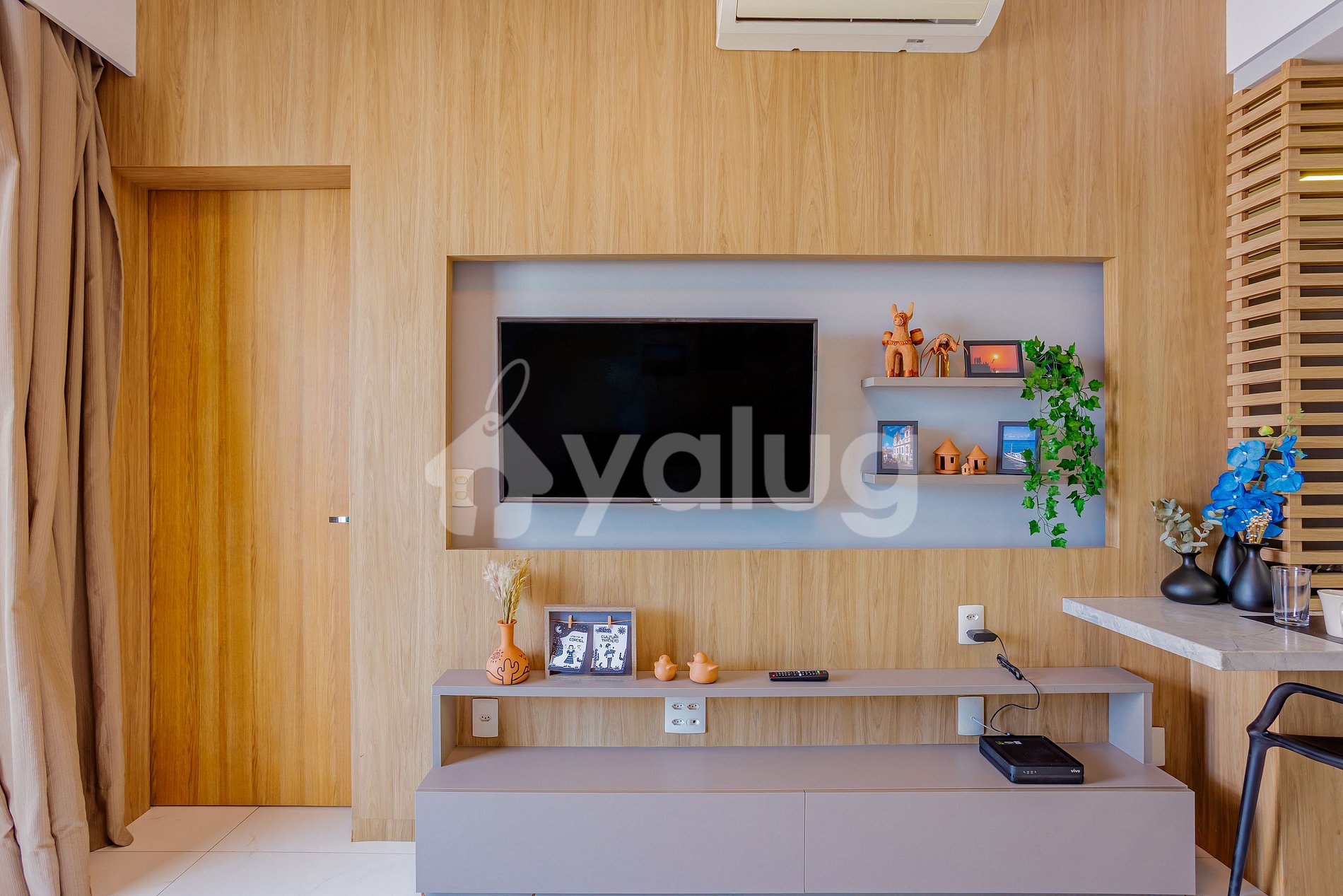 Living Room: Double sofa bed, smart TV, air conditioning, and blackout curtains