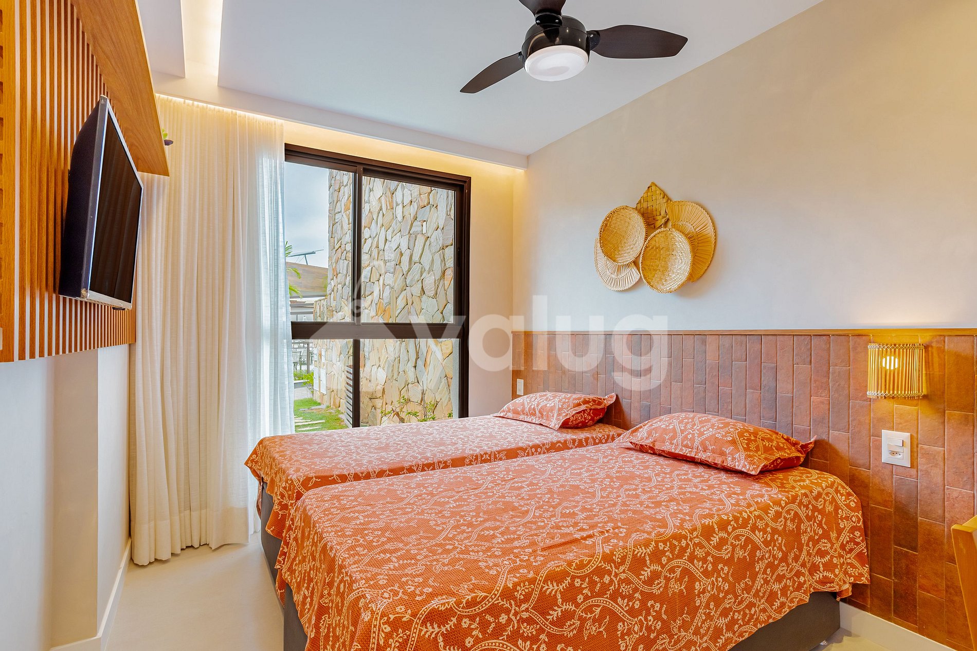 Bedroom: 2 single beds, TV, ceiling fan, and closet.
