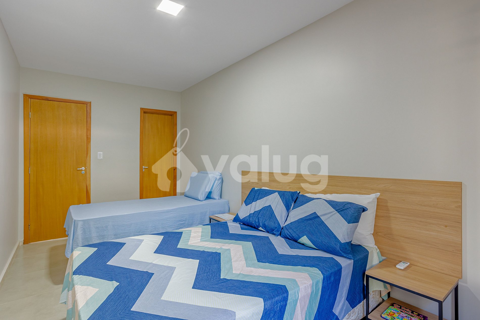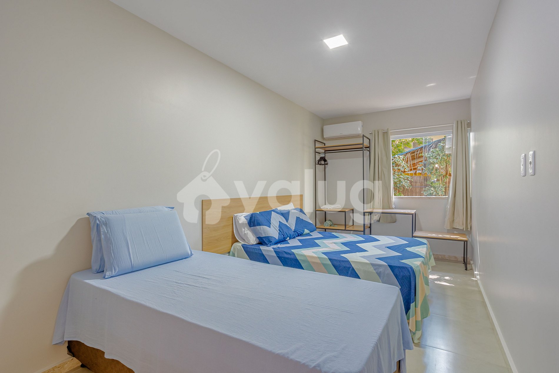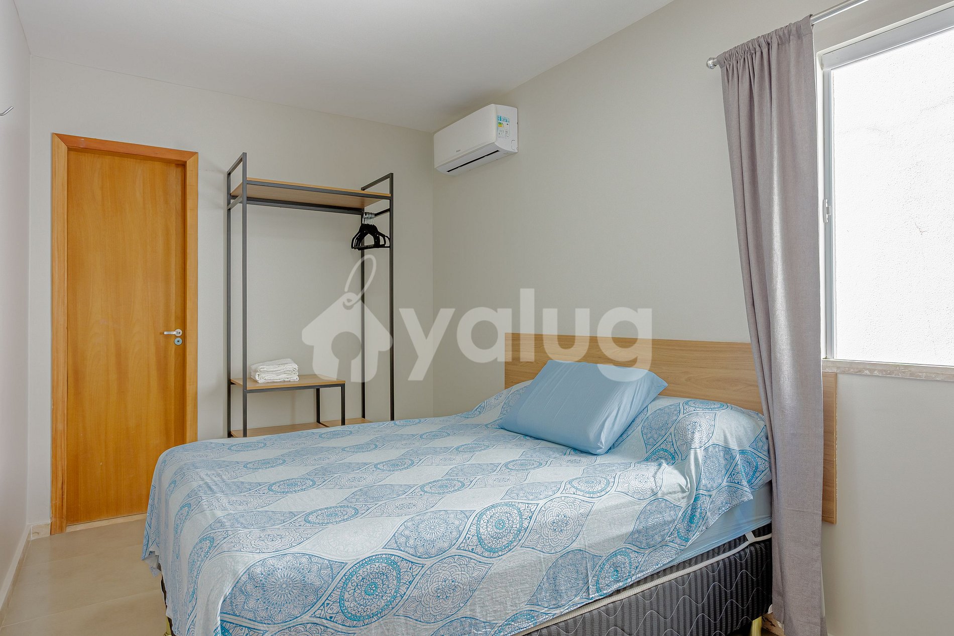 Bedroom: 1 double bed, 1 single mattress, air conditioning, curtains, blackout curtains and wardrobe.