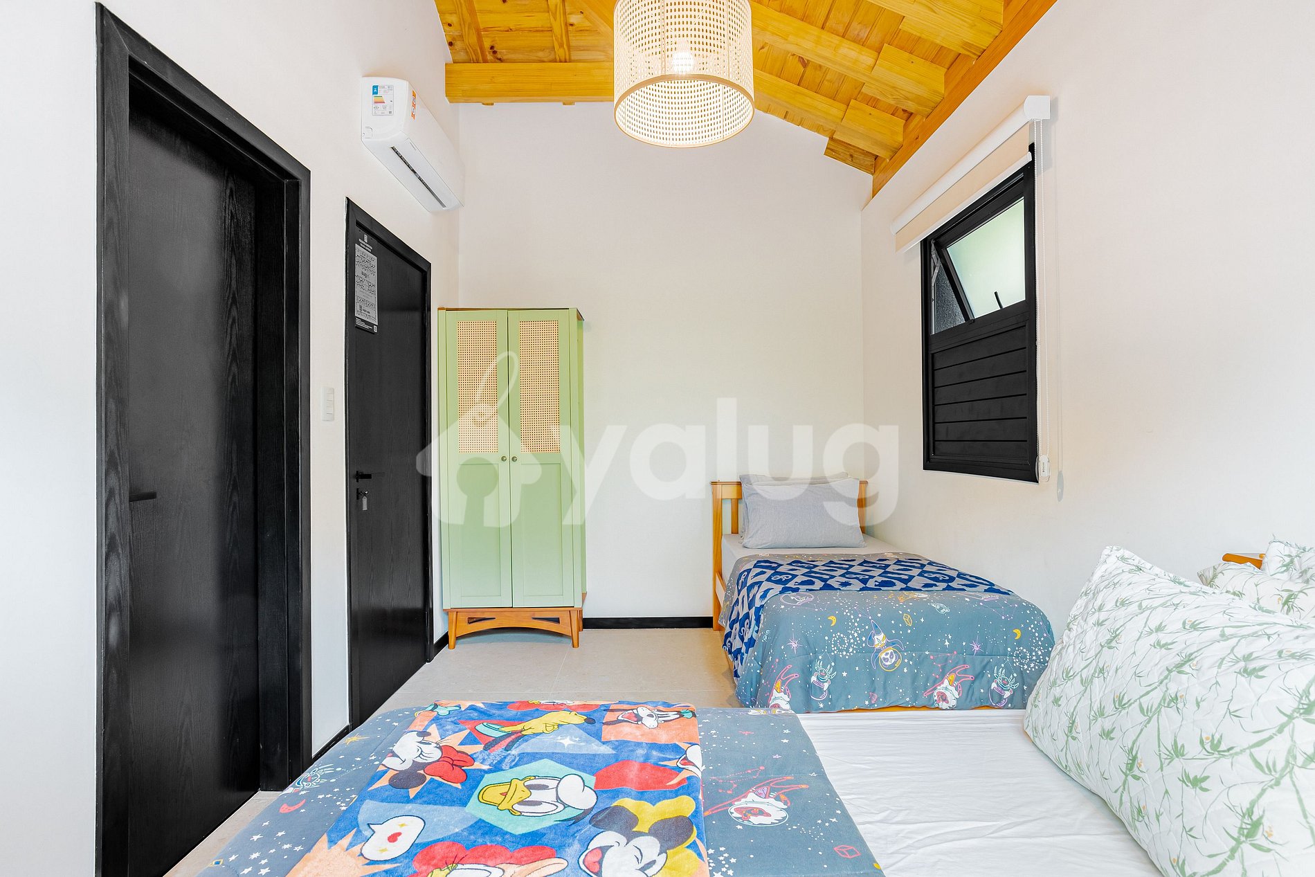 Suite 3: 2 single beds + extra single bed, air conditioning, wardrobe, and blackout curtains.