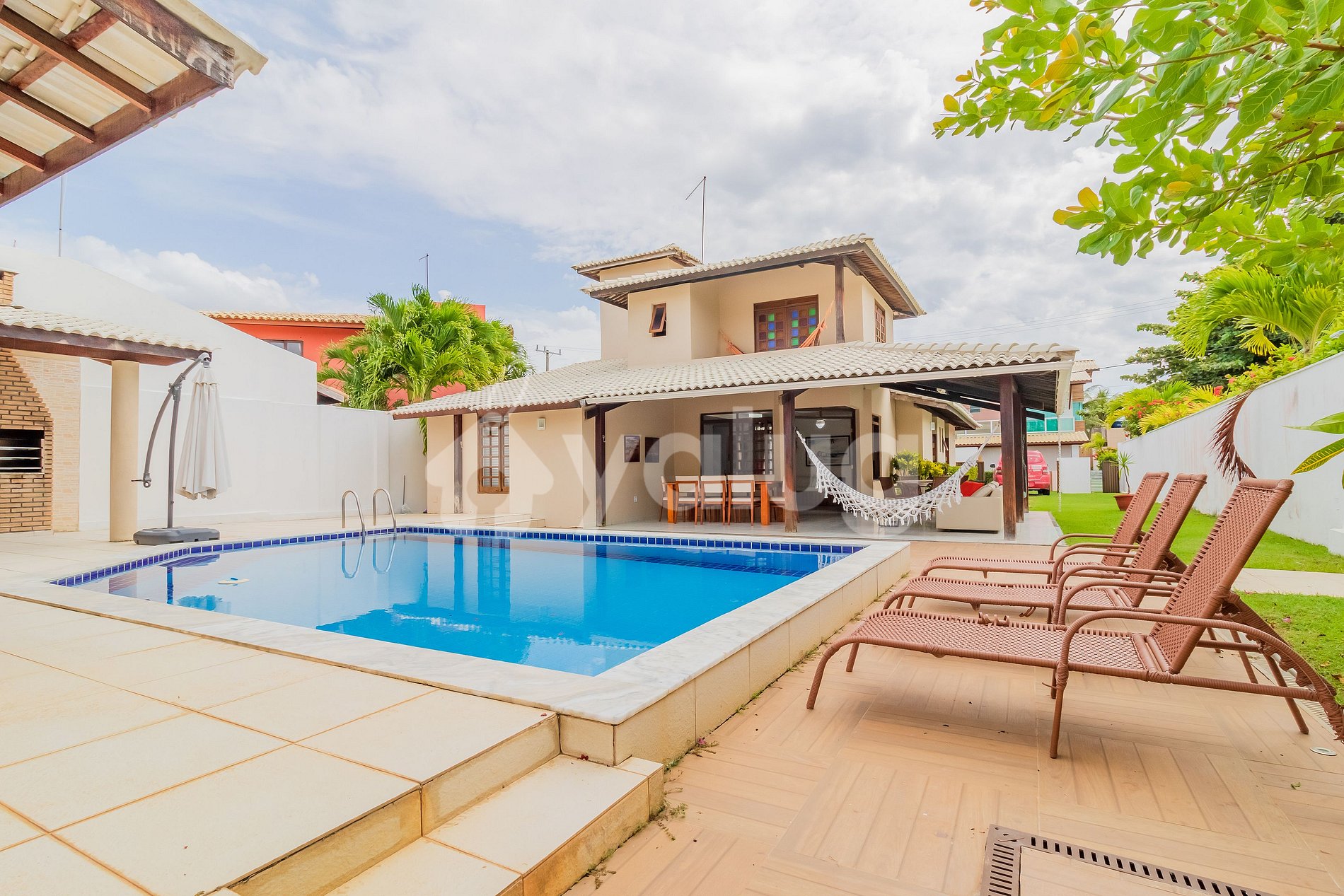 Ubicado en Condomínio Paraíso, con seguridad las 24 horas, mi propiedad cuenta con sala de estar con Smart TV, Wi-Fi, cocina totalmente integrada, 5 habitaciones (3 suites), 4 en la planta baja y 1 en la planta superior, todas con aire acondicionado acondicionado. Además, dispone de una gran zona exterior de ocio, con asientos y hamaca en el porche, piscina y barbacoa.