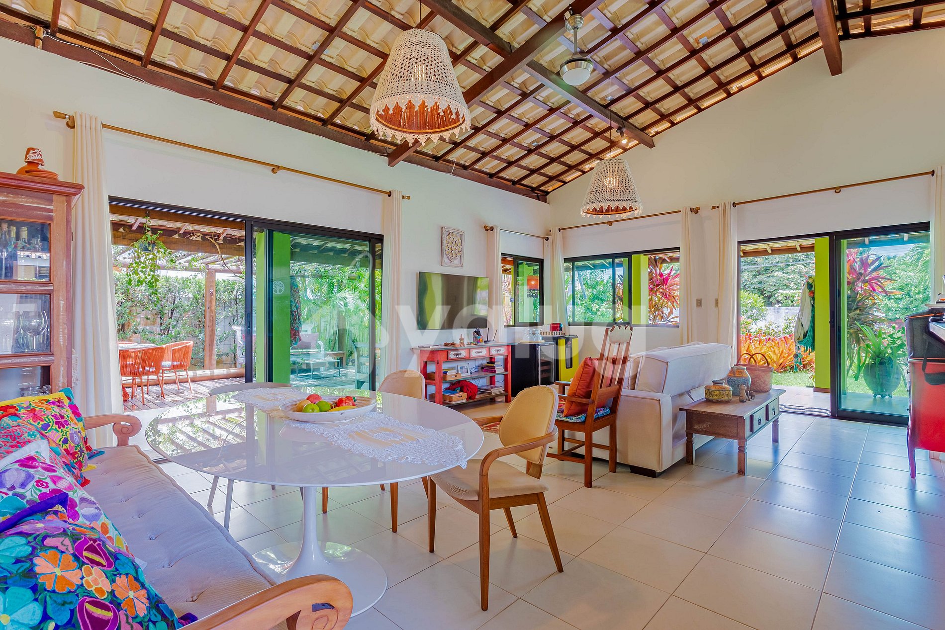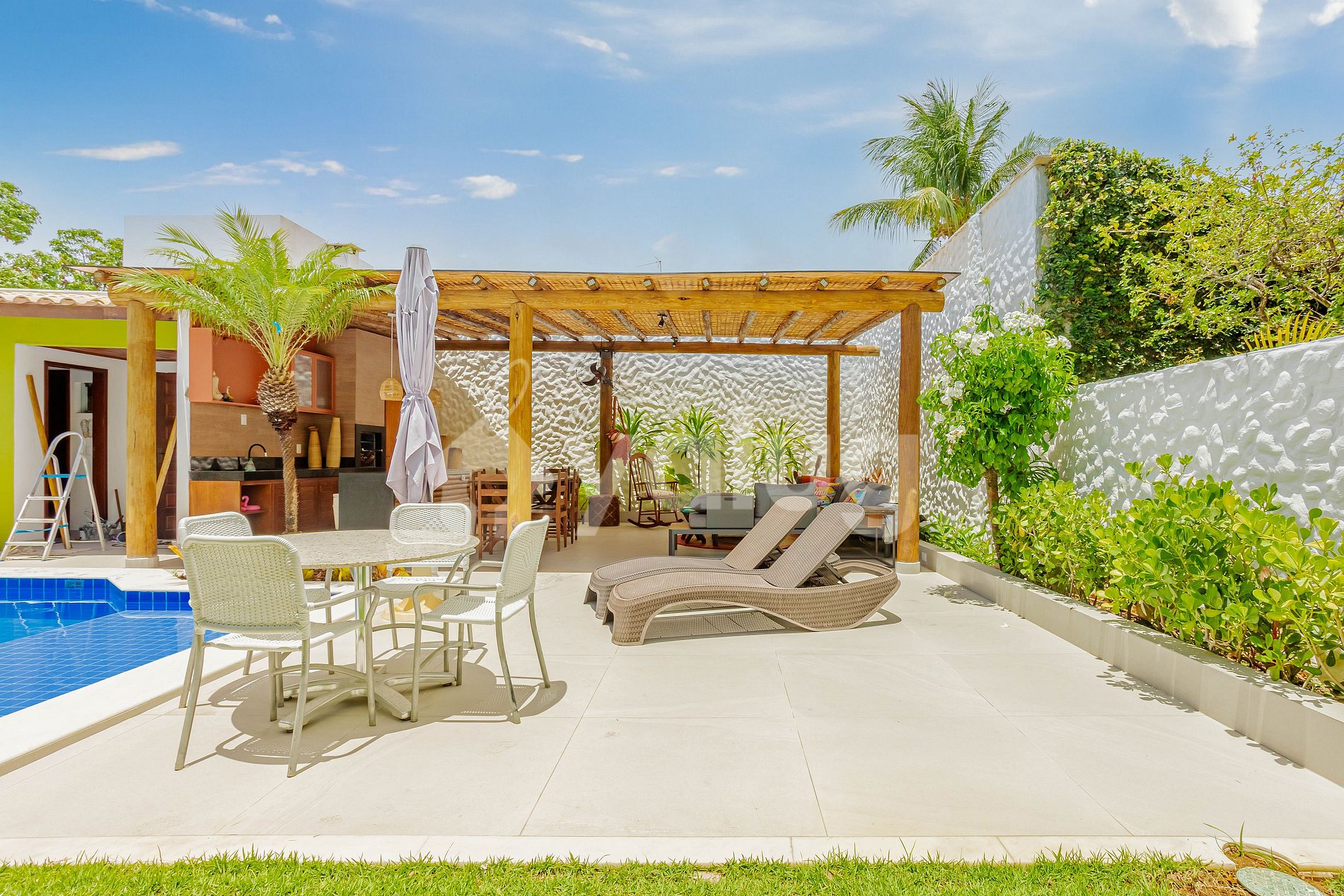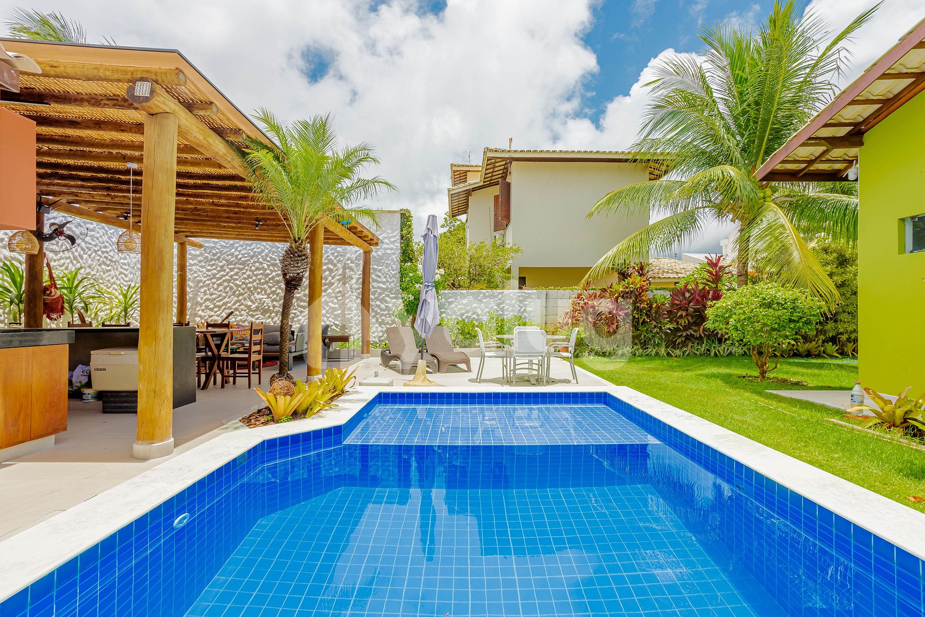 Hermosa casa de 4 dormitorios ubicada en el Condominio Mar Azul, cerca de la playa y de los mejores chiringuitos (Prefeitinho y Carlinhos), con excelente infraestructura. Además, la casa cuenta con una amplia zona exterior con hamaca, piscina, jardín y zona gourmet con barbacoa.
