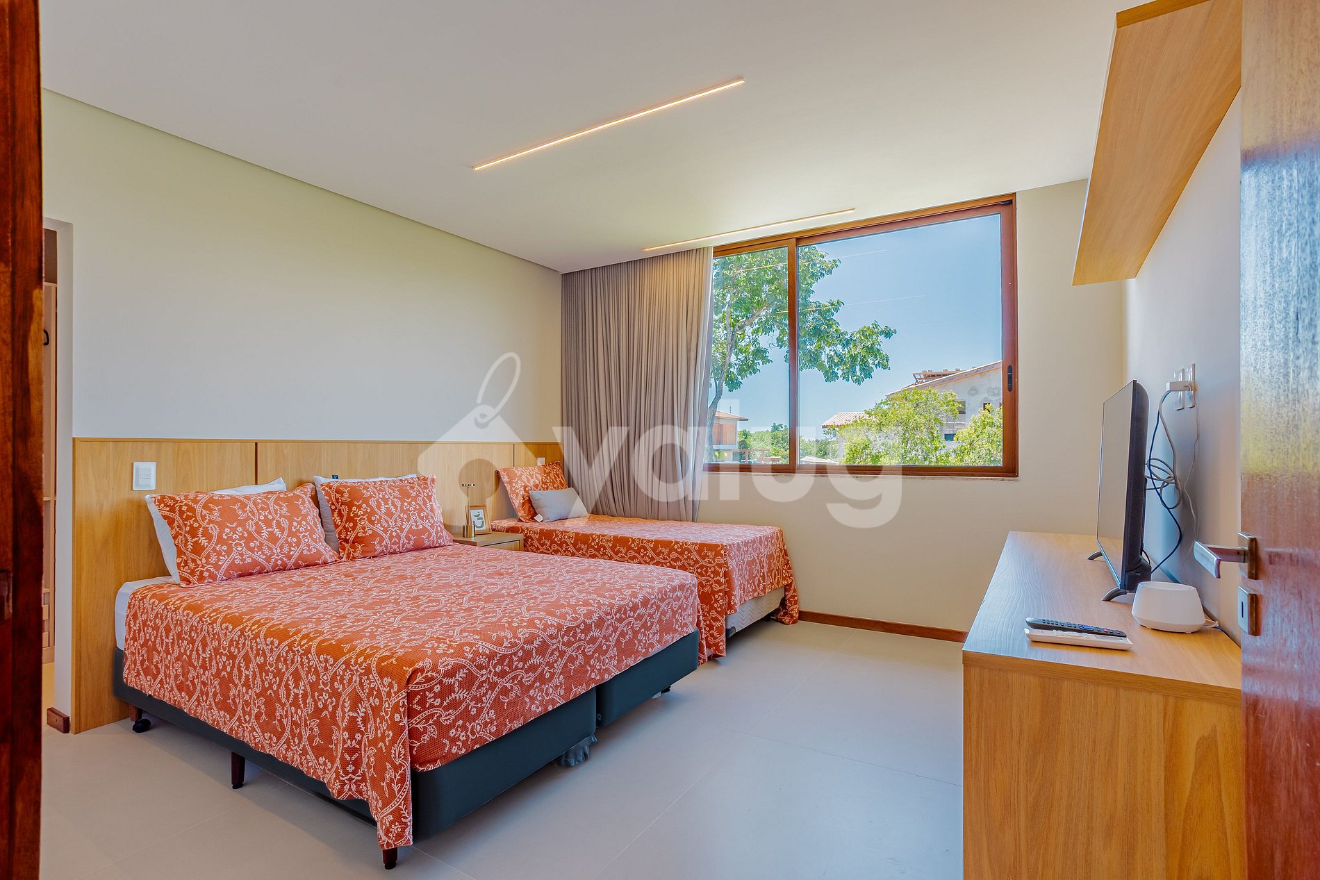 Suite 2 (planta alta): 1 cama doble, 1 cama individual, aire acondicionado split, armario, cortinas opacas y Smart TV;