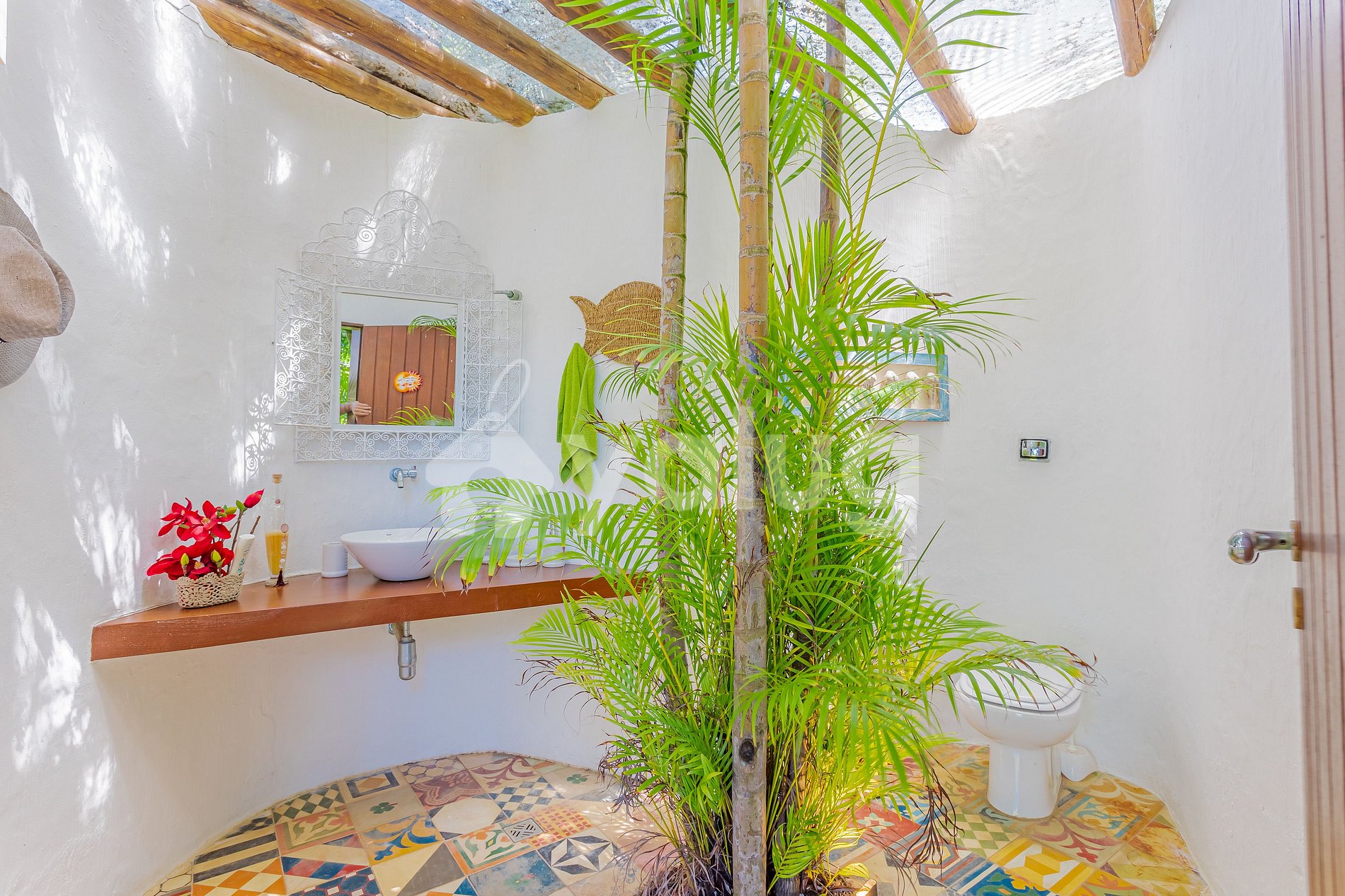 La propiedad cuenta con un extenso jardín lleno de árboles frutales, como cocoteros, mangos, cerezos, aguacates y limoneros, que ofrecen a los huéspedes la oportunidad de disfrutar de agua de coco fresca y deliciosas frutas durante el verano. También hay hierbas como hierba de limón y hierba santa para hacer tés. Un puente conduce a una pequeña isla, agregando un toque especial al entorno.