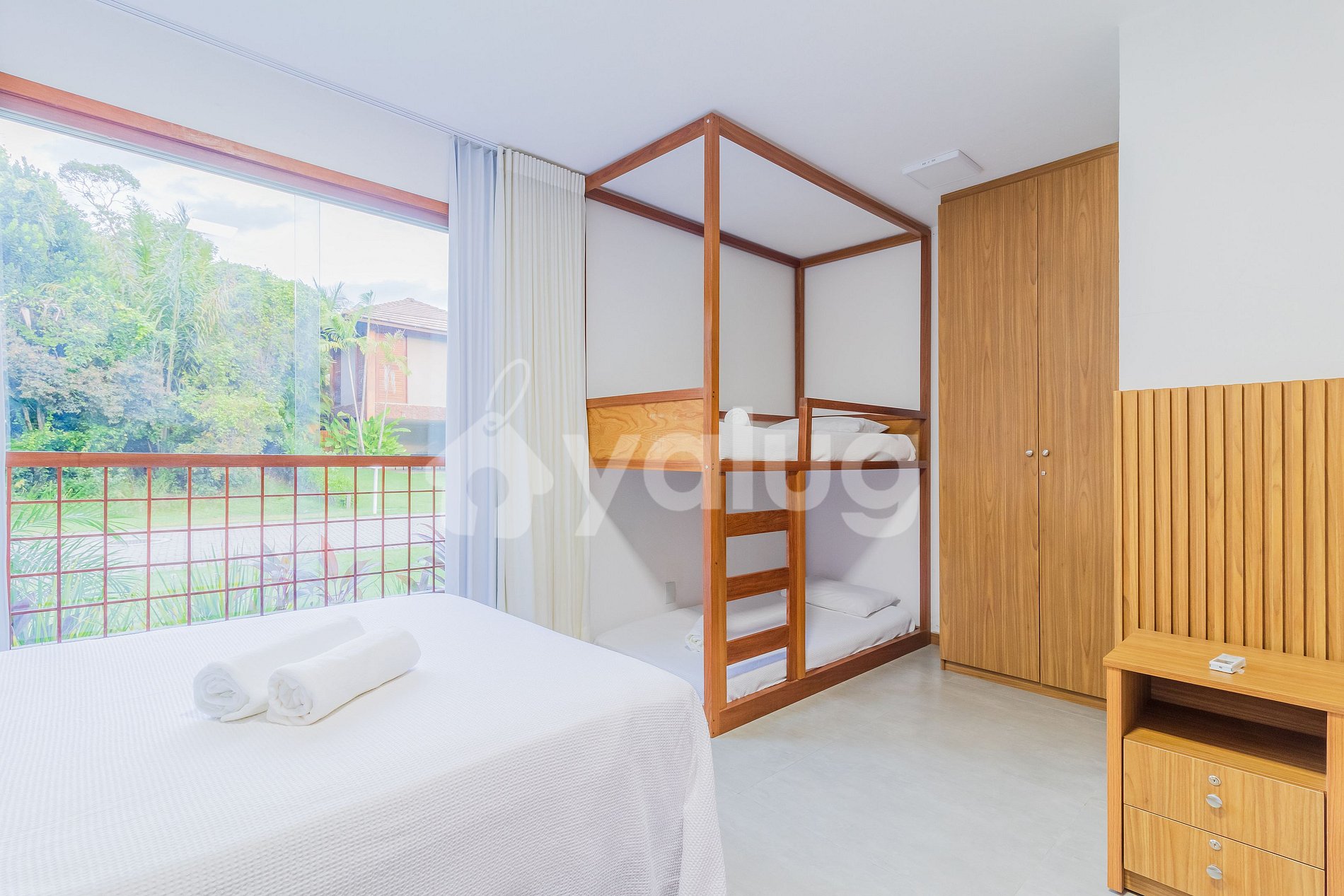 Además de todo lo que ofrece mi espacio, el condominio cuenta con excelente seguridad e infraestructura, dos piscinas, un área deportiva, una cancha de tenis de playa, un área verde (reserva de la Mata Atlántica) y conserjería las 24 horas. También hay servicio de transporte gratuito de viernes a domingo para acceder al complejo y a la playa. Los horarios están sujetos a disponibilidad.