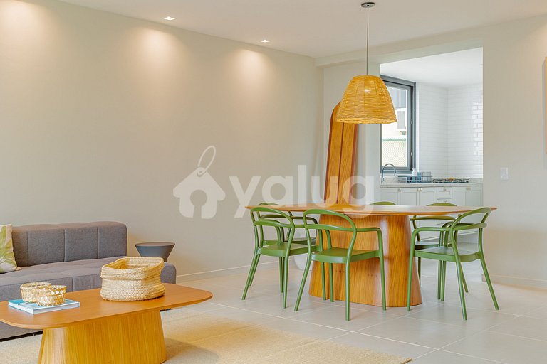 Excelente apartamento, con vista al mar, equipado con 2 suites y 1 dormitorio simple, ambos climatizados, sala y comedor finamente decorados, cocina completa con todos los elementos necesarios para su mejor estadía, excelente área gourmet en la terraza con asador, minibar.