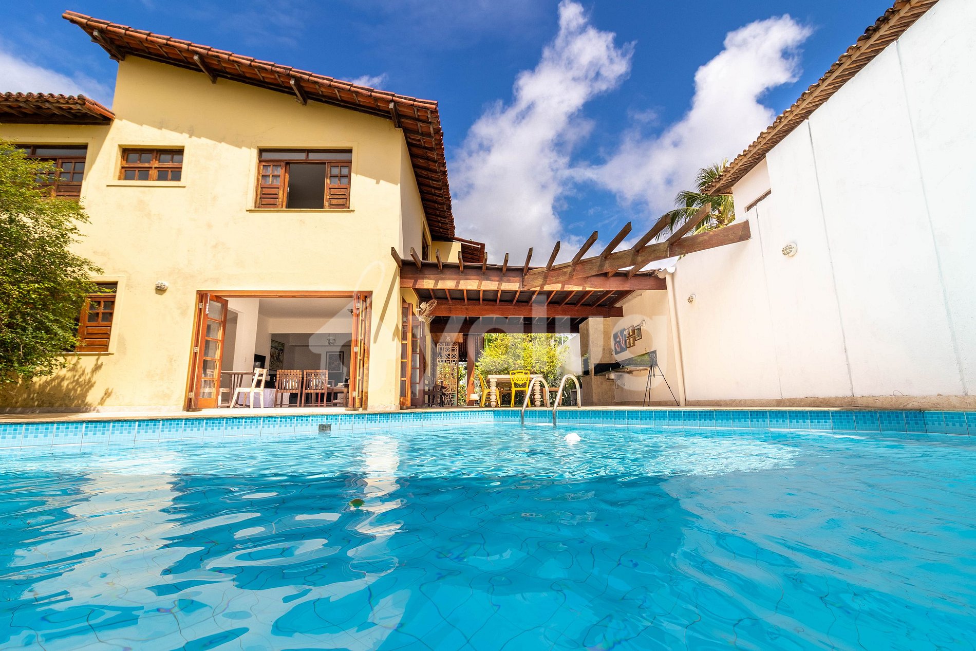 La casa cuenta con una amplia zona exterior equipada con piscina, zona de juegos y zona gourmet cubierta con barbacoa. Todas las habitaciones están equipadas con aire acondicionado tipo split, salón con barra y cocina totalmente equipada.