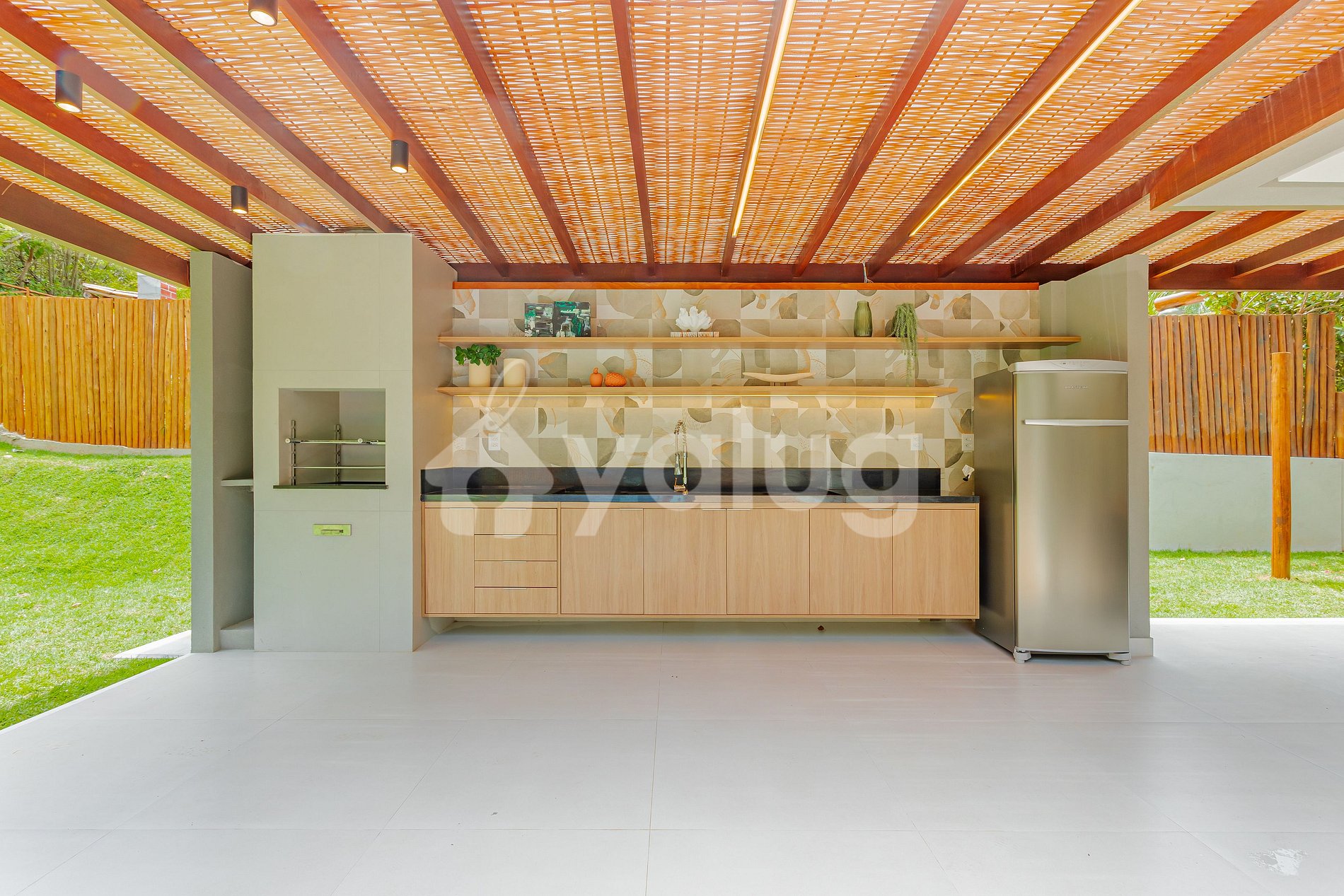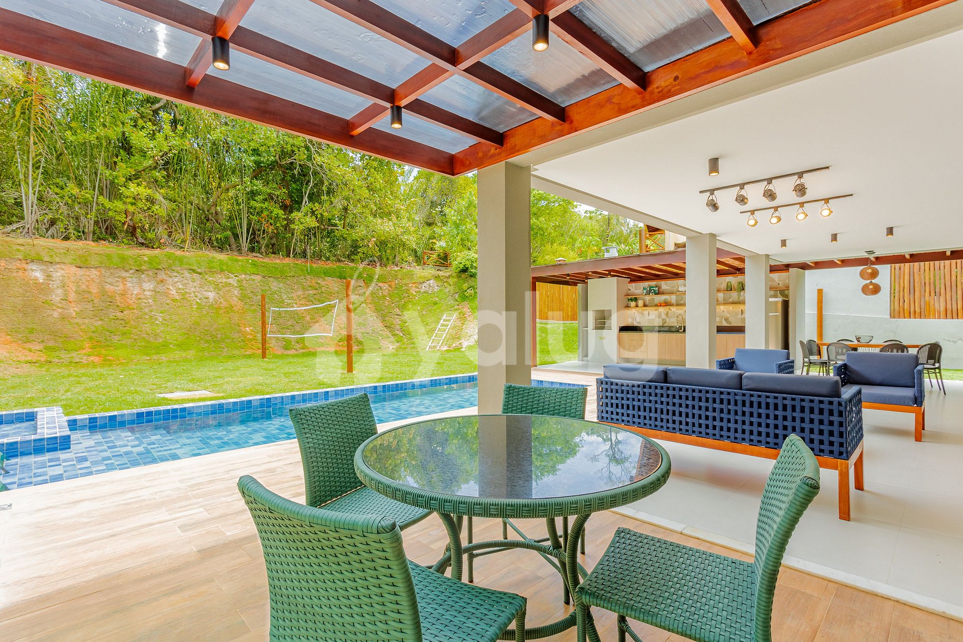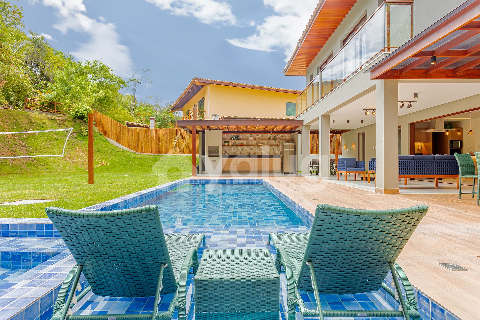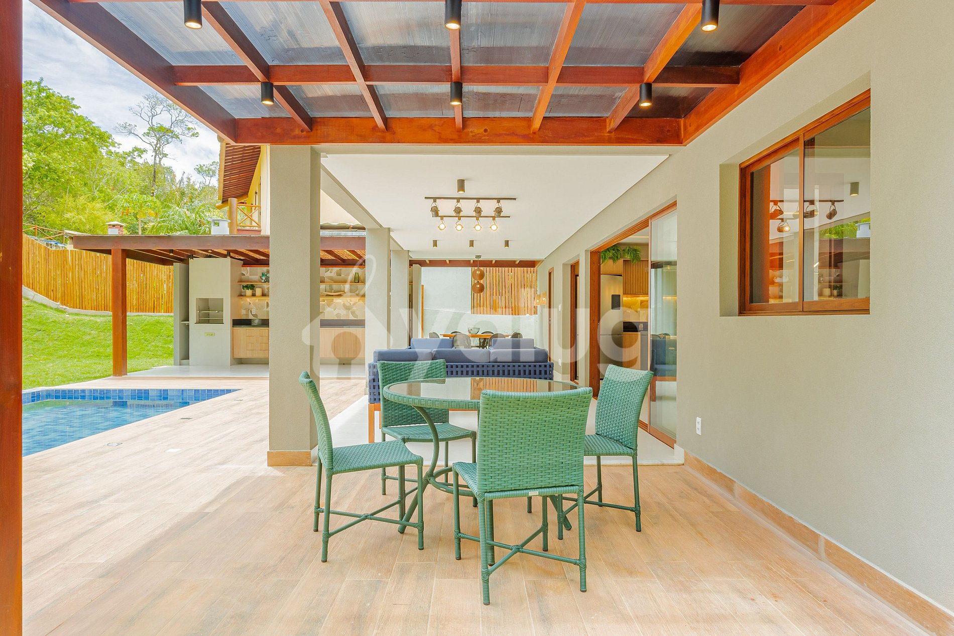 ¡La zona gourmet es increíble! ¡Está equipado con una gran piscina, excelente barbacoa, varios muebles de exterior y jardín! ¡La sala y el comedor son espaciosos y están bellamente decorados para su recepción! Además, la propiedad cuenta con una hermosa cocina con todos los elementos esenciales.