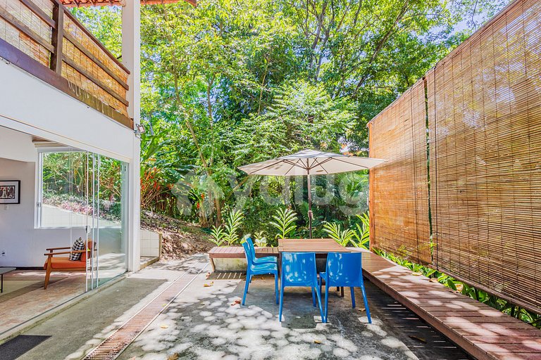 El espacio se compone de dos casas integradas, con 3 habitaciones (1 suite), todas con aire acondicionado, sala, cocina completa y balcón, ¡ideal para relajarse!