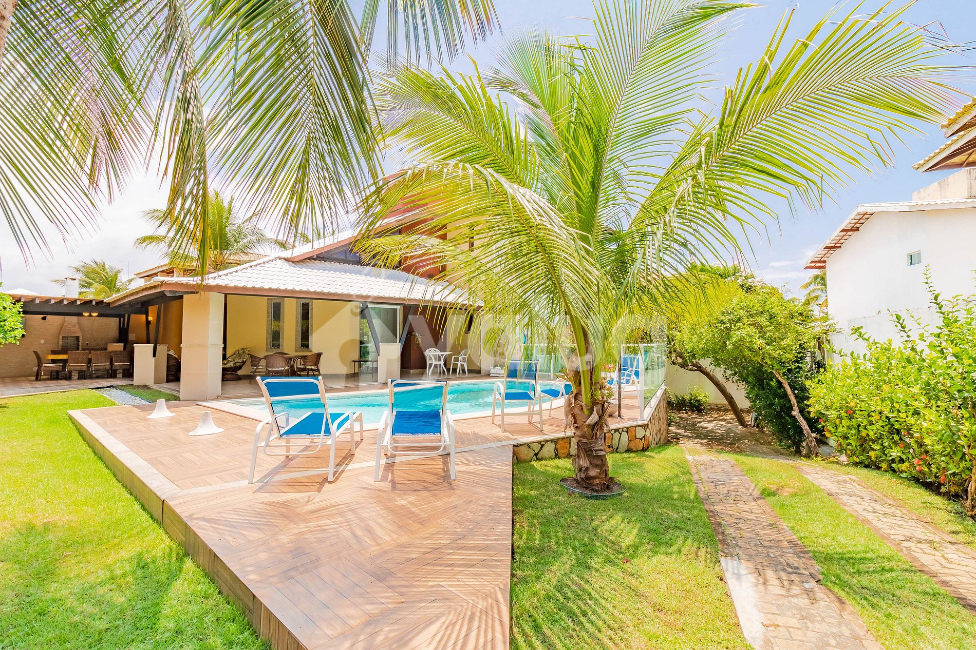 Es una gran casa, que consta de 5 dormitorios (3 suites), ubicada en Condomínio Paraíso, con infraestructura completa, área deportiva, sala de juegos, gimnasio al aire libre, parque infantil y seguridad las 24 horas, ¡todo a 50 m de la playa de Guarajuba!