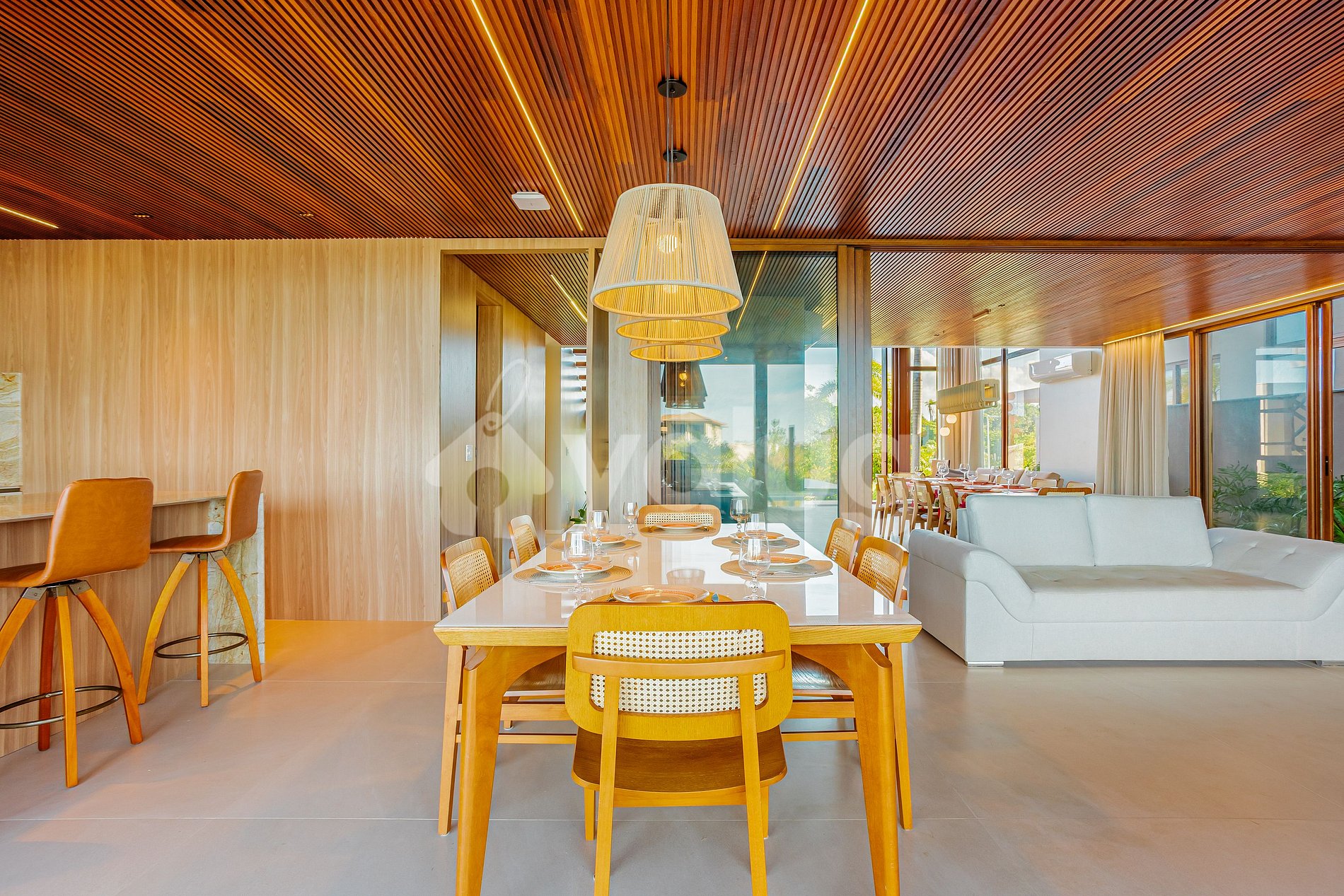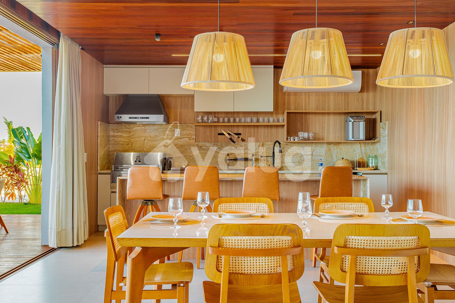 La casa, a solo 400 metros de la playa, cuenta con siete hermosas suites, incluyendo un cuarto de servicio; una espaciosa sala de estar y comedor; dos cocinas completamente equipadas; y, lo mejor de todo, ¡un área gourmet con una hermosa piscina, muebles de exterior y jardín!