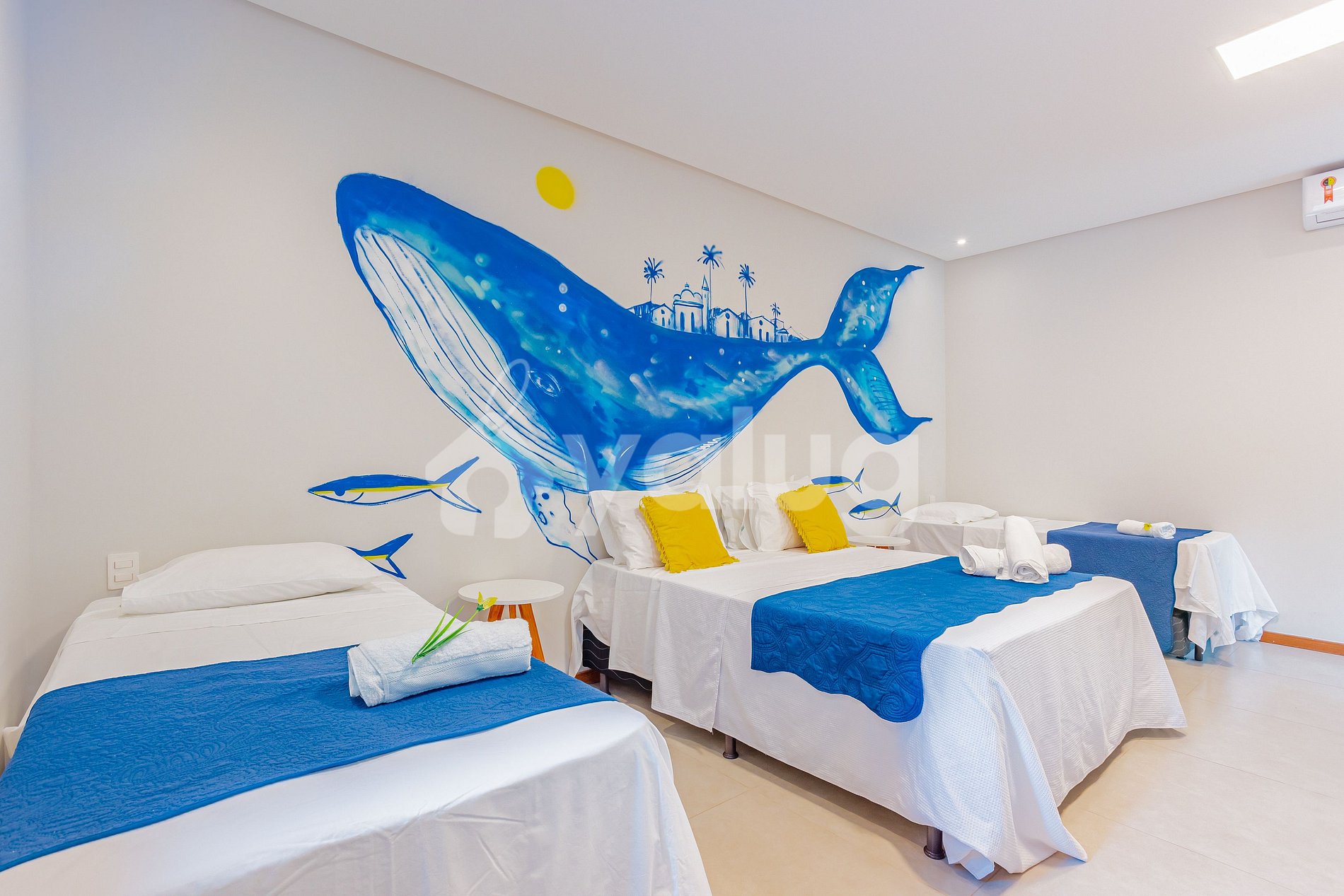 Suite 3 (superior): 1 cama queen size, 2 camas individuales, aire acondicionado, cortinas opacas y armario.