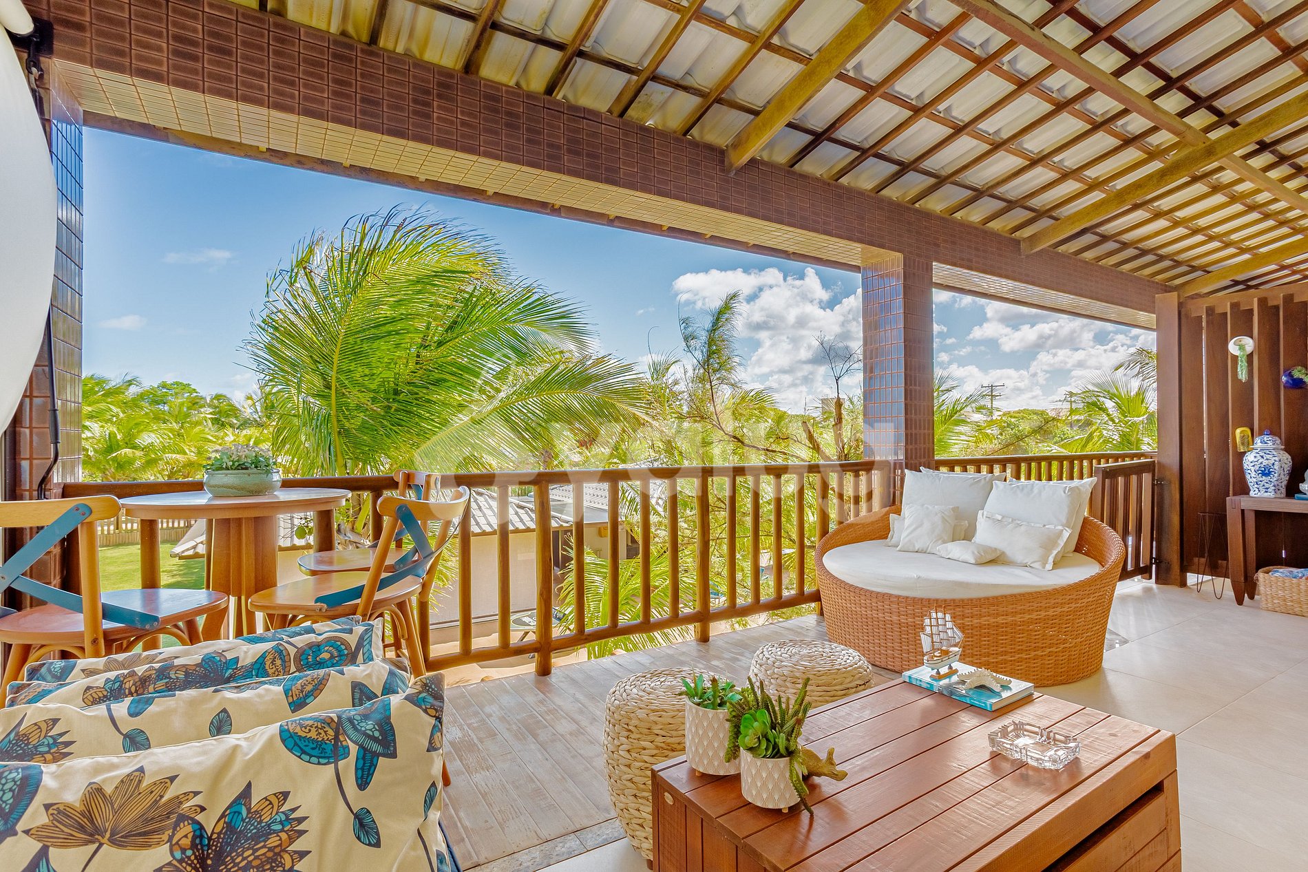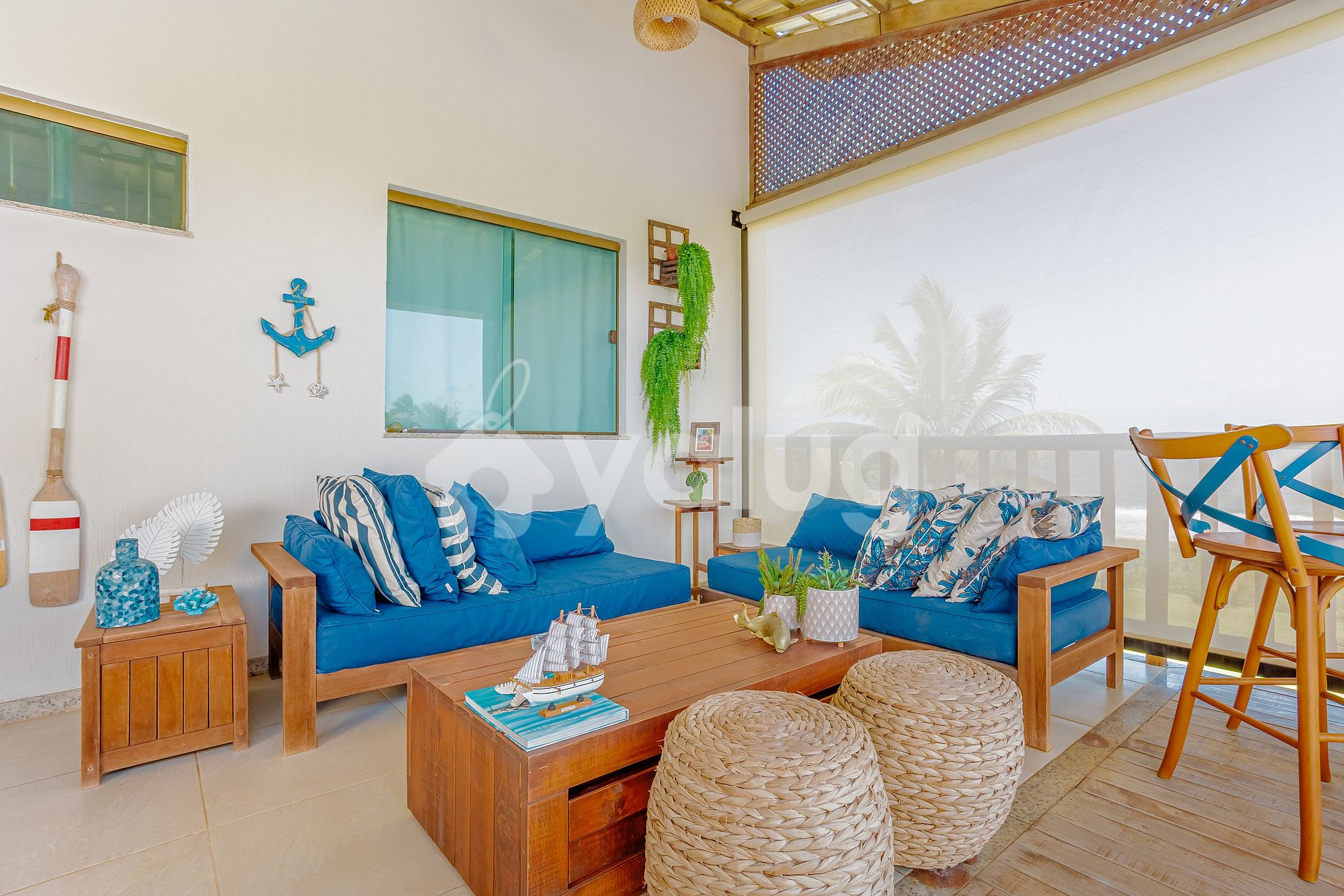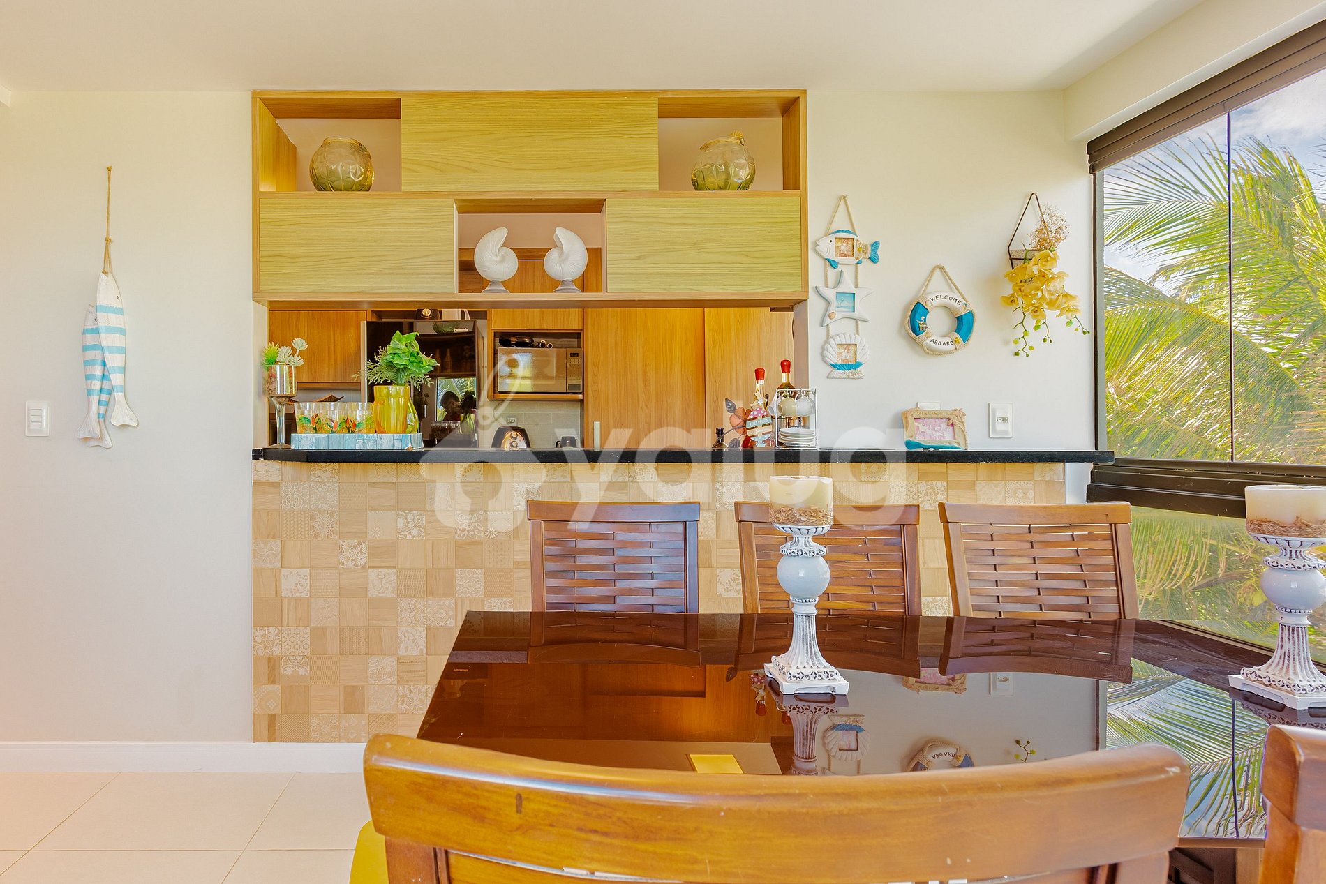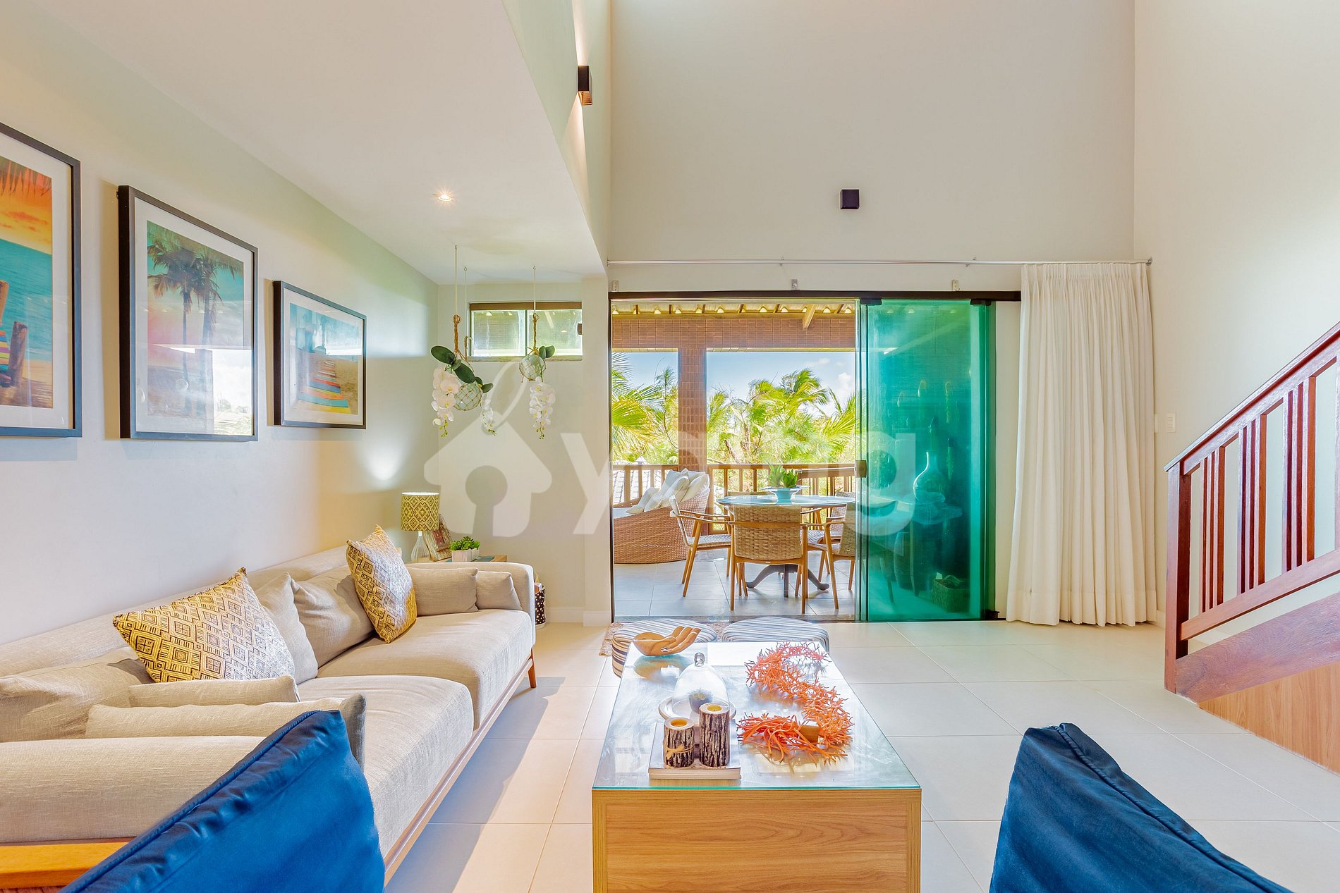 Apartamento pé na areia no Absolut Ville com 4 suítes, ideal para até 9 pessoas. Ambiente amplo, confortável e aconchegante, incluindo sala de estar, sala de jantar, cozinha equipada e varanda com vista para o mar.