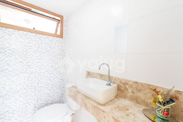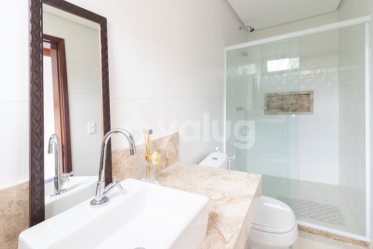 O espaço dispõe de 6 suítes (2 térreas), todas com ar condicionado tipo Split. Além disso, você encontrará uma sala de estar equipada com Smart TV, mesa de jantar para 5 pessoas e uma cozinha completa.