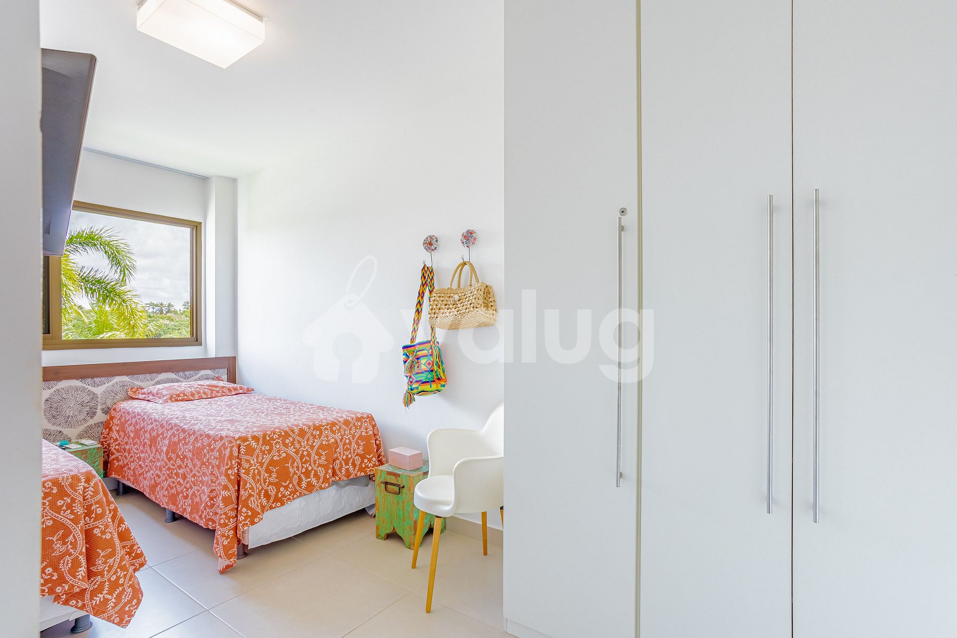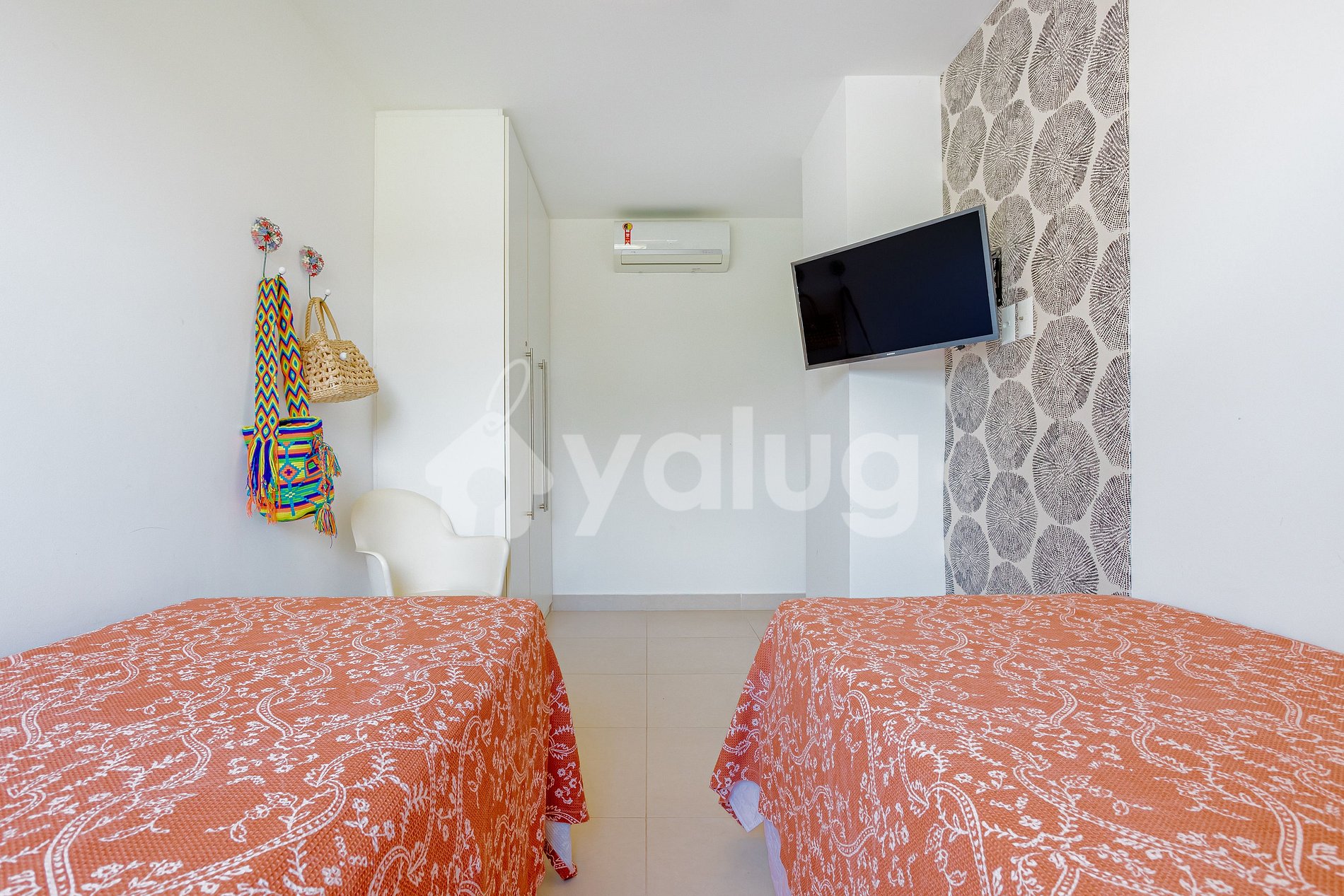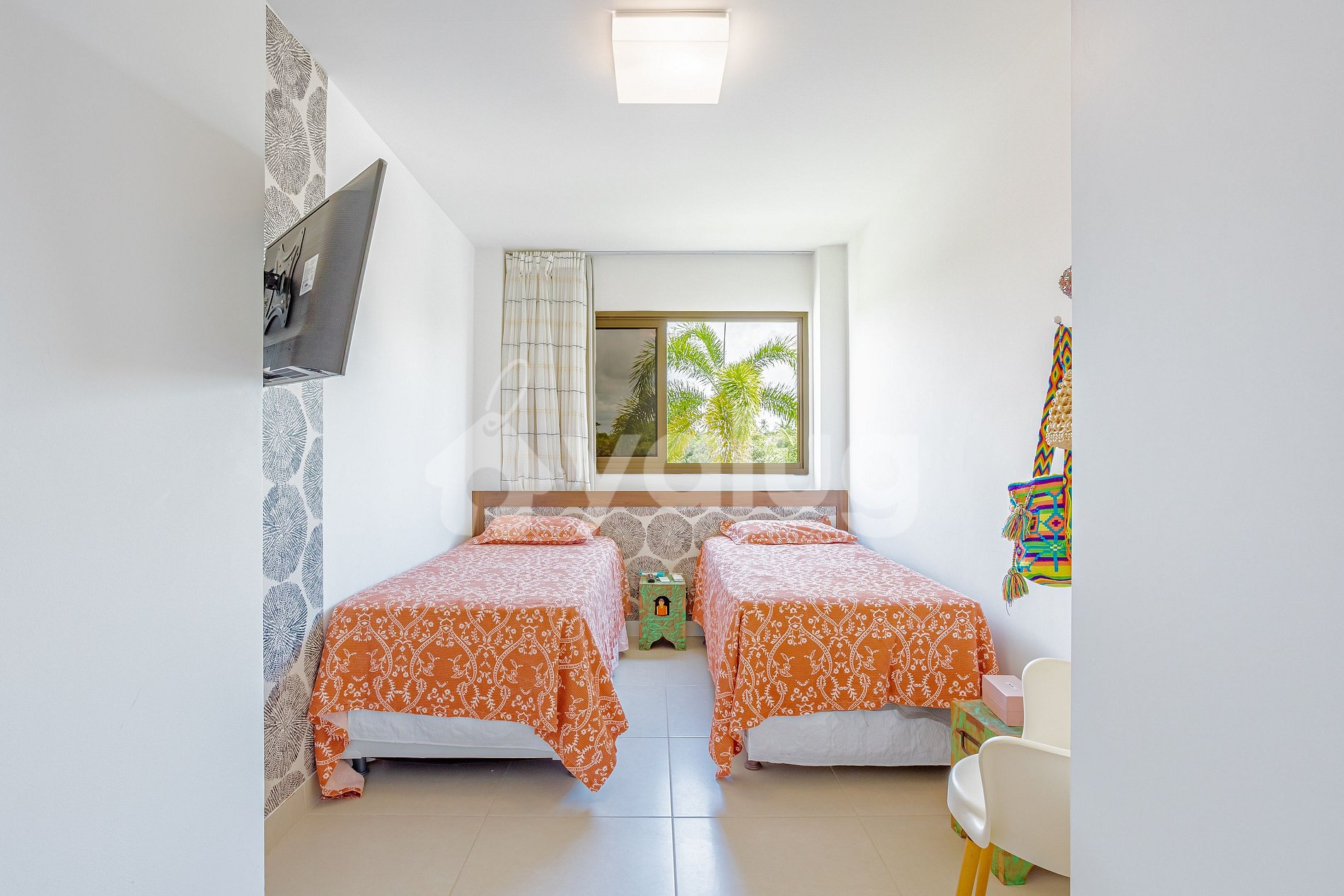Quarto: 2 camas solteiro, TV, ar-condicionado, cortina, black out e armário.