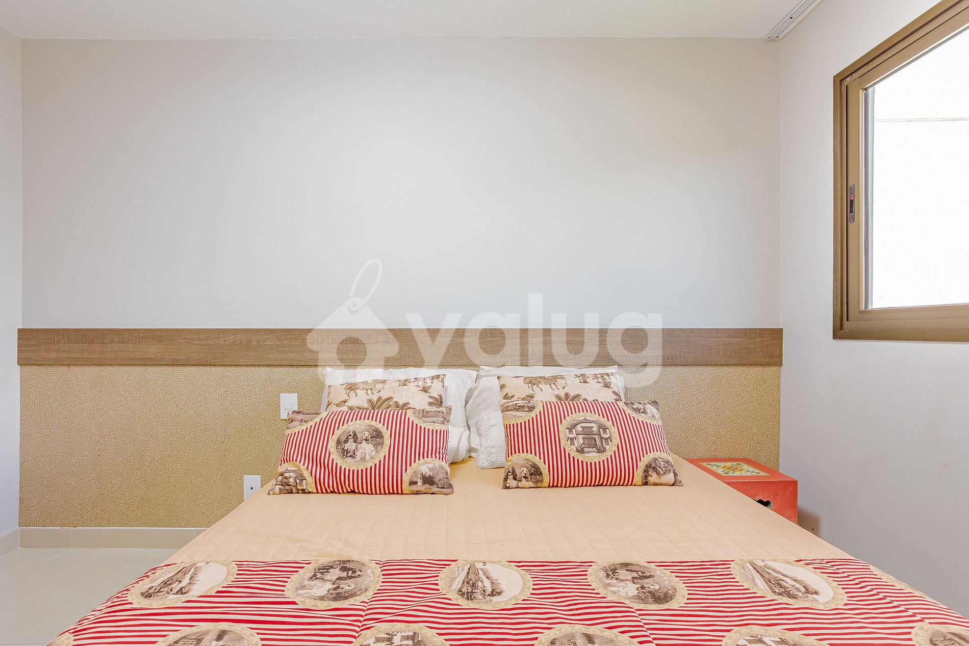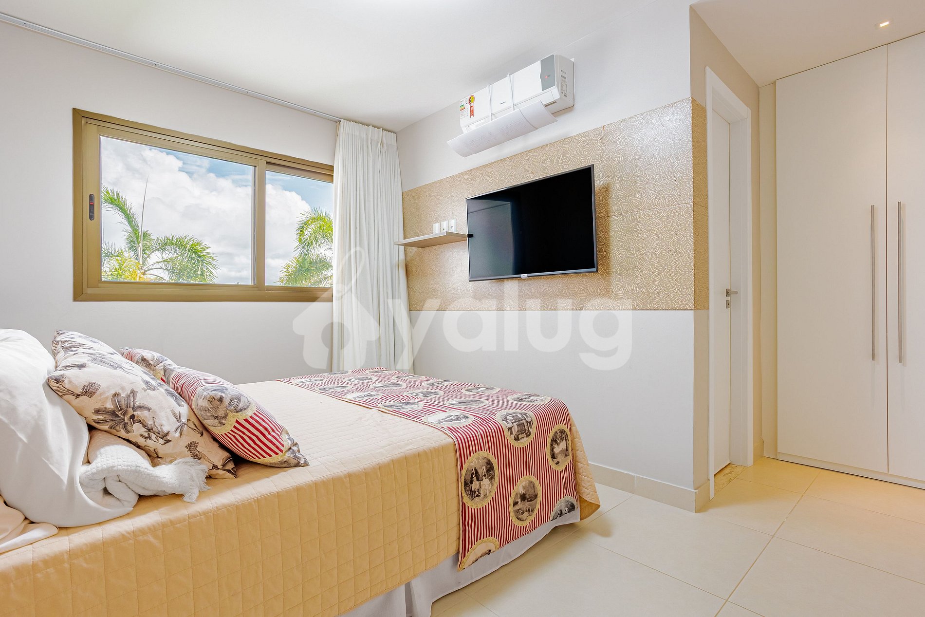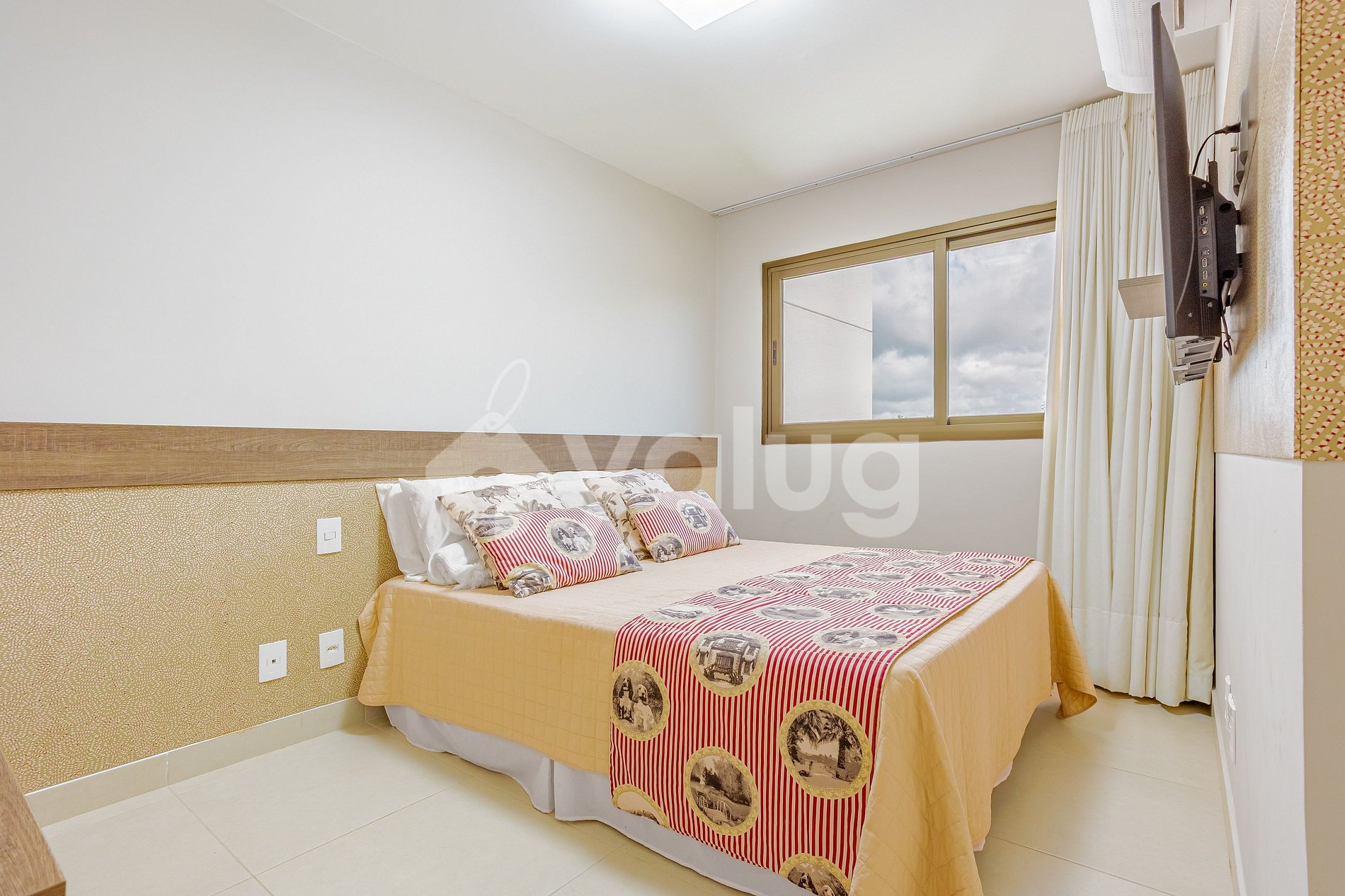 Suíte: 1 cama queen, TV, ar-condicionado, cortina, black out e armário.