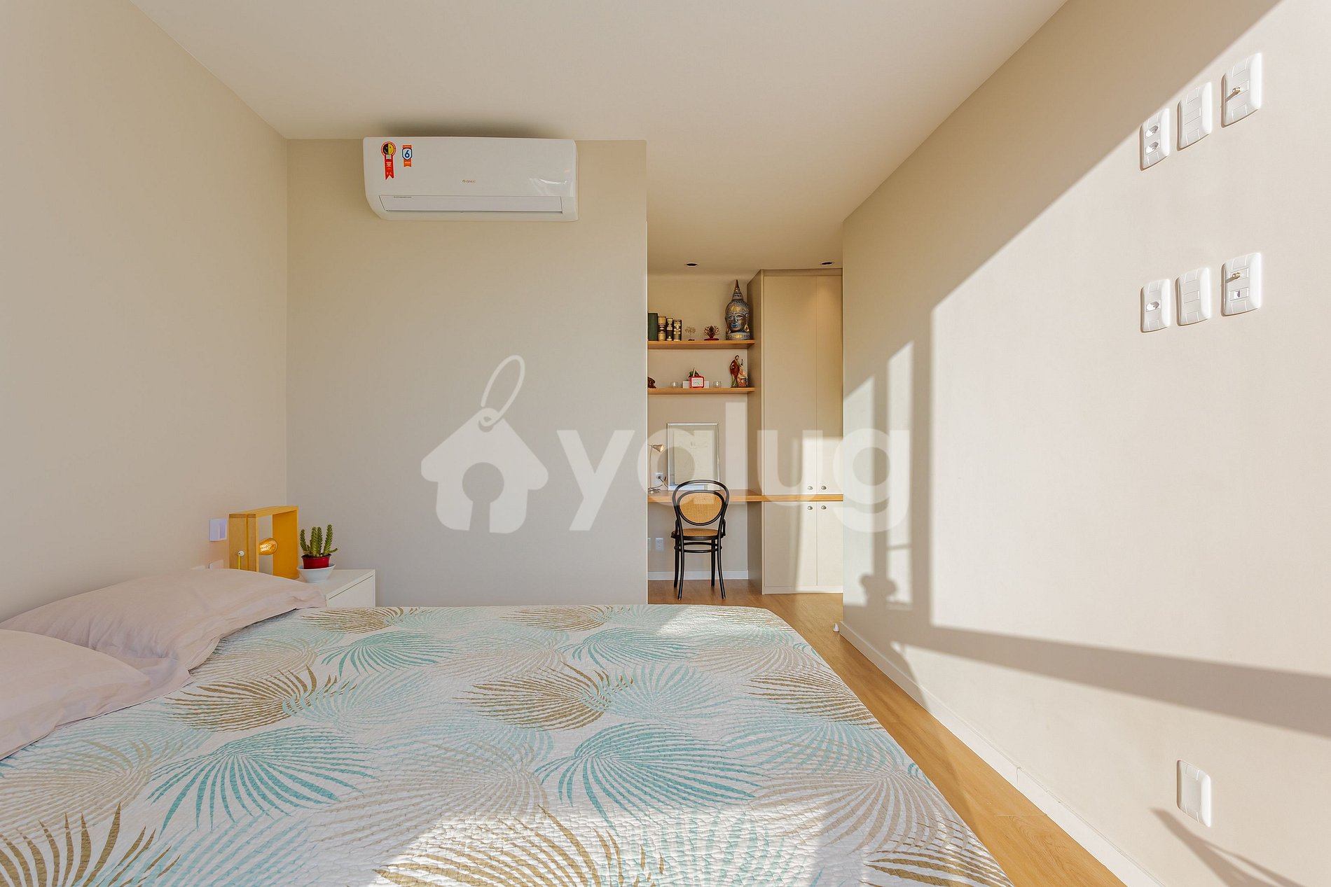Suíte 1: 1 cama casal, ar condicionado split, cortina e armário;