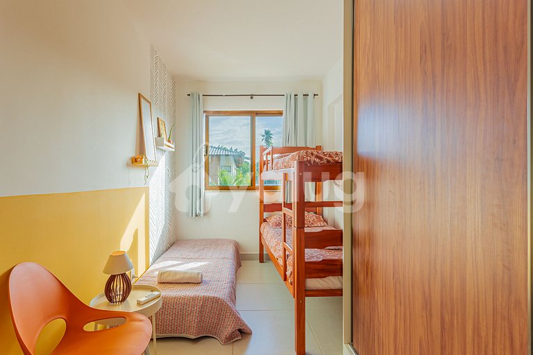Quarto 2 (superior): 1 beliche com auxiliar, ar condicionado split, cortina blackout e armário.