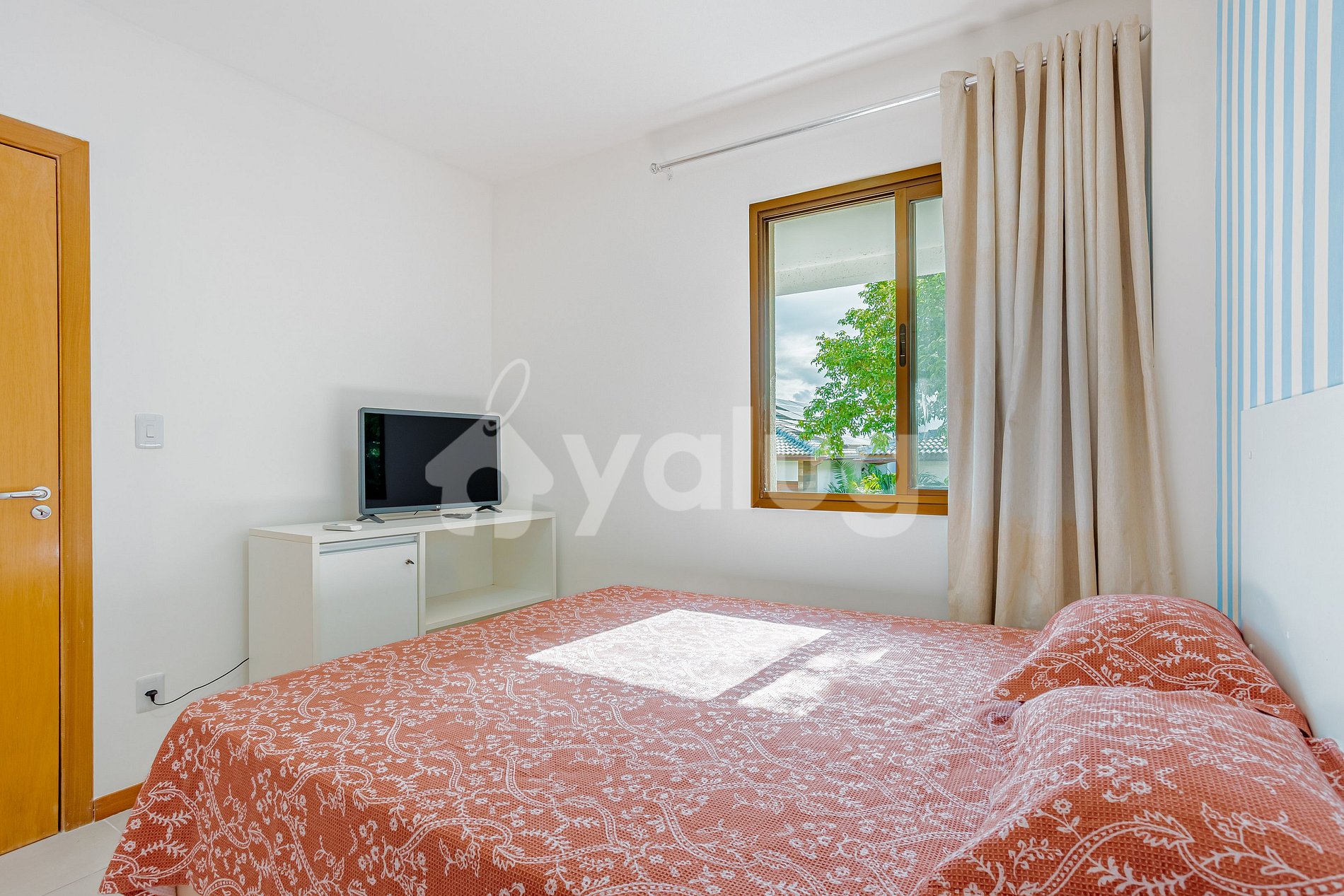 Sala: Sofá-cama casal, tv e cortina blackout.