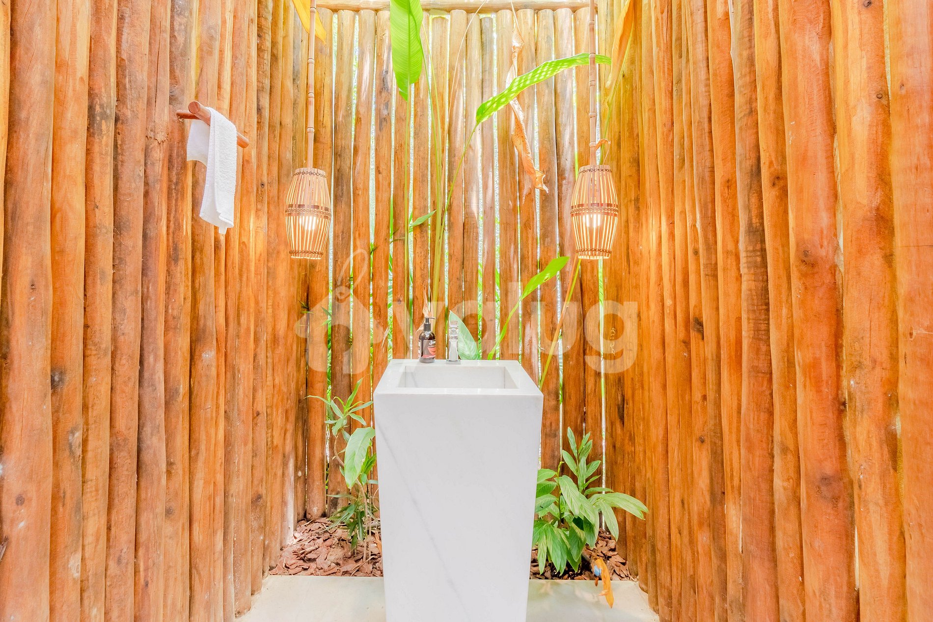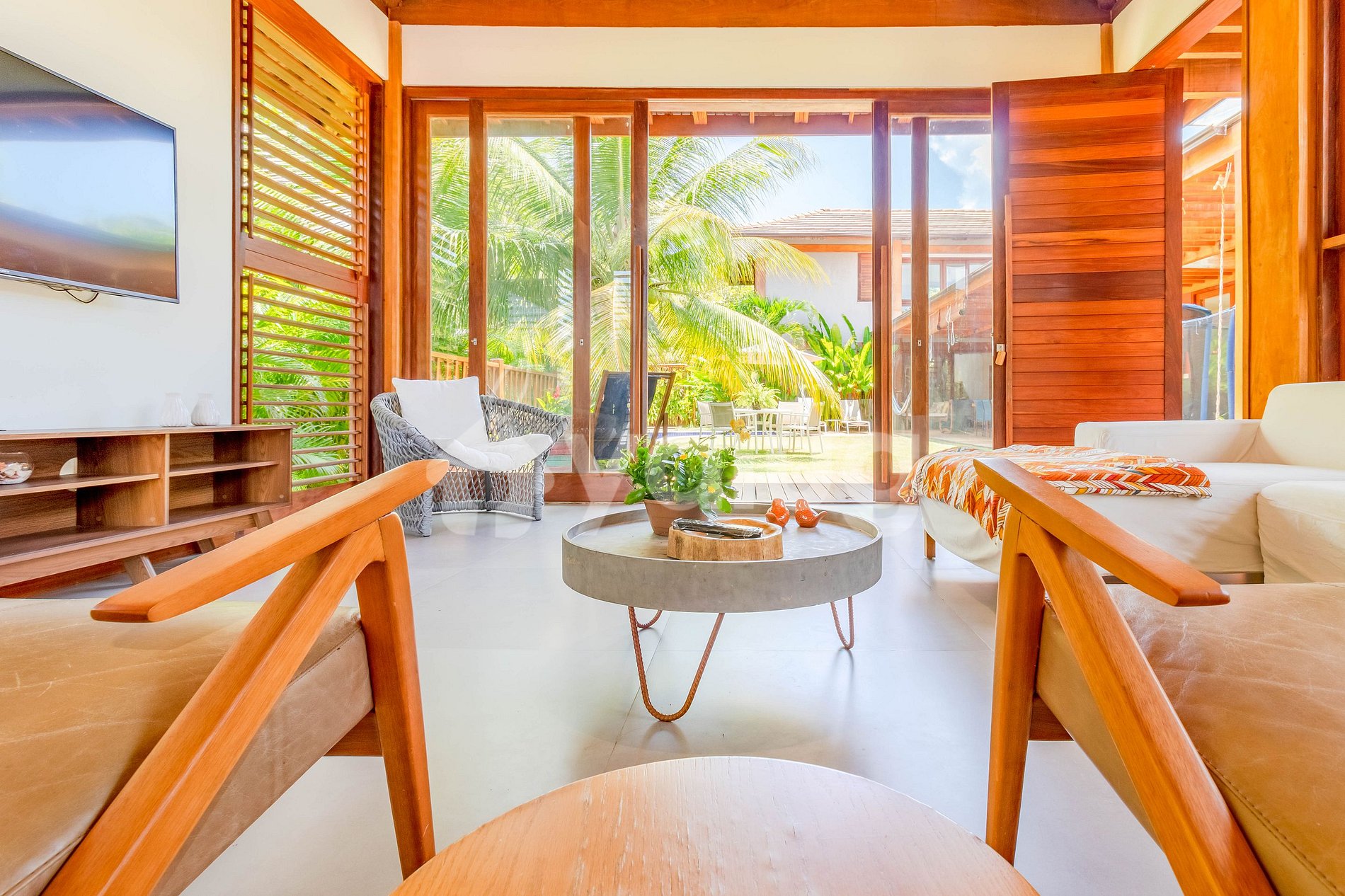 A área externa da casa é sem dúvidas a melhor parte, sendo equipada com piscina, mobílias para refeições e uma área verde de contato direto com a natureza.