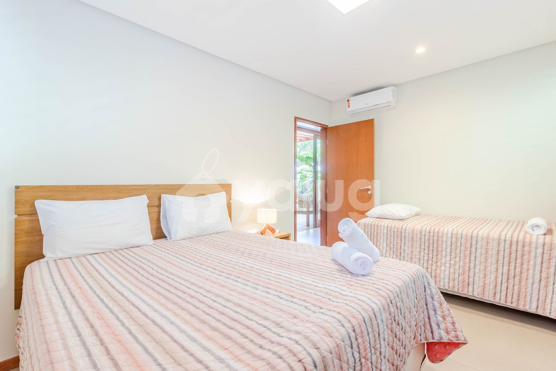 Quarto 1 (Térreo): 1 cama Queen, 1 bicama, ar condicionado tipo Split, cortina blackout e armários.