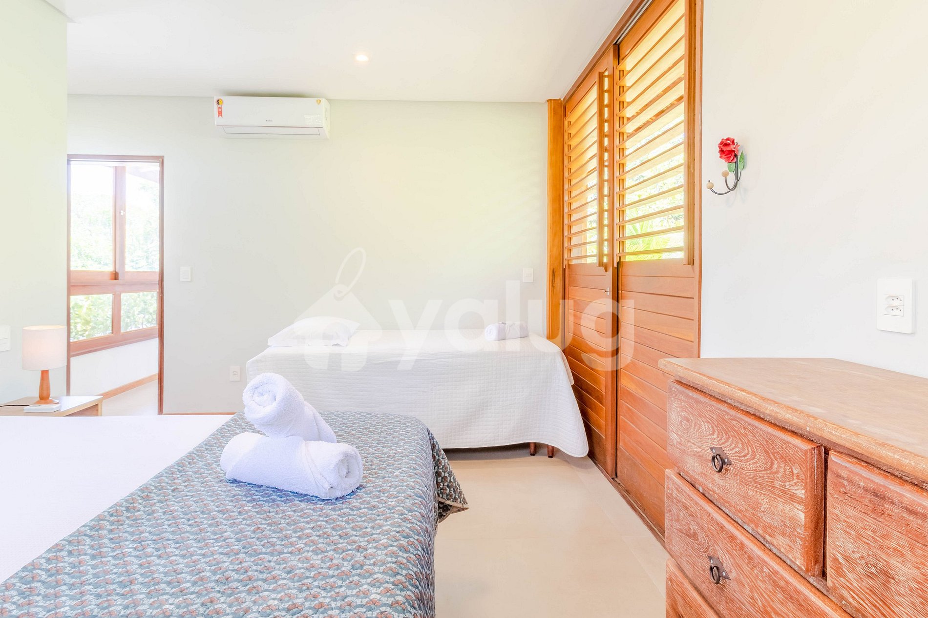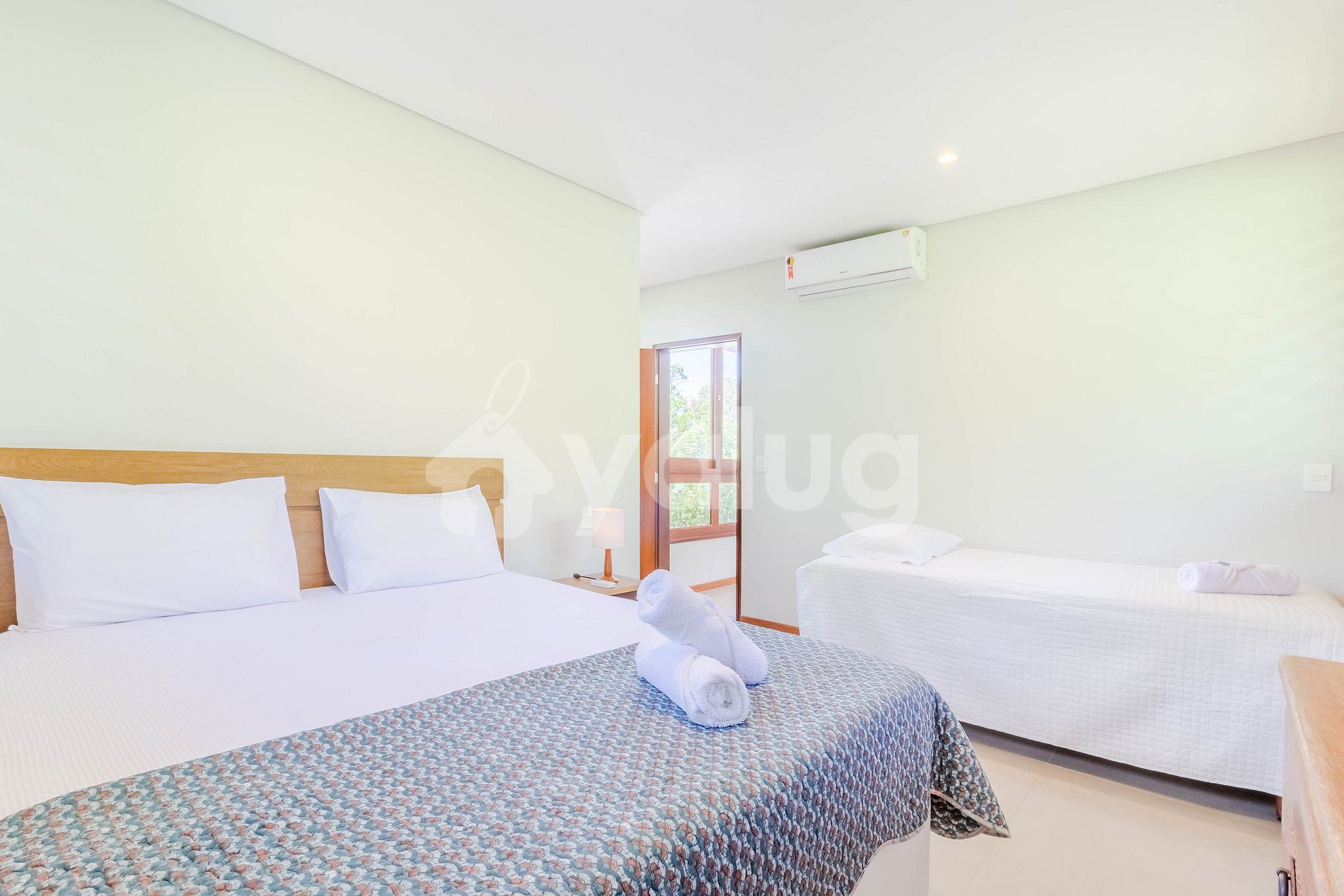 Suíte 2 (Térreo): 1 cama Queen, 1 cama de Solteiro, ar condicionado tipo Split, cortina blackout e armários.