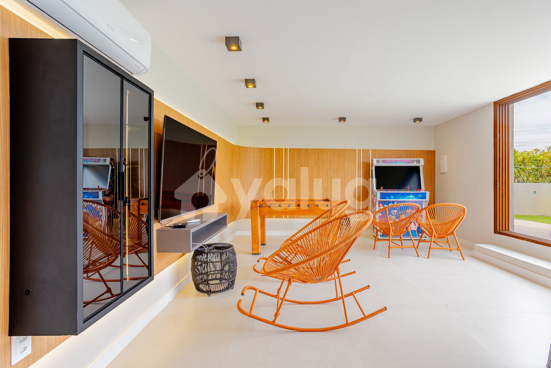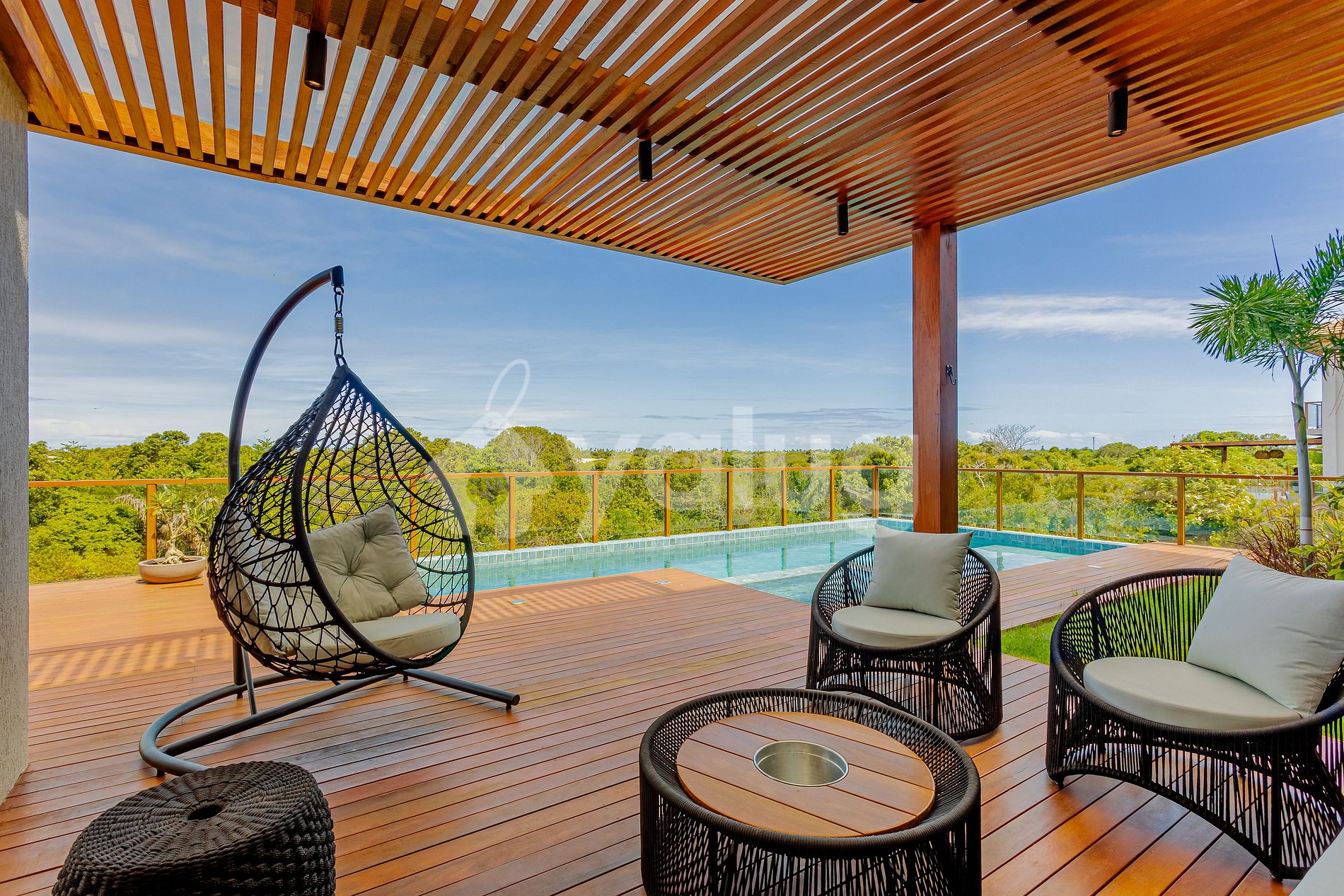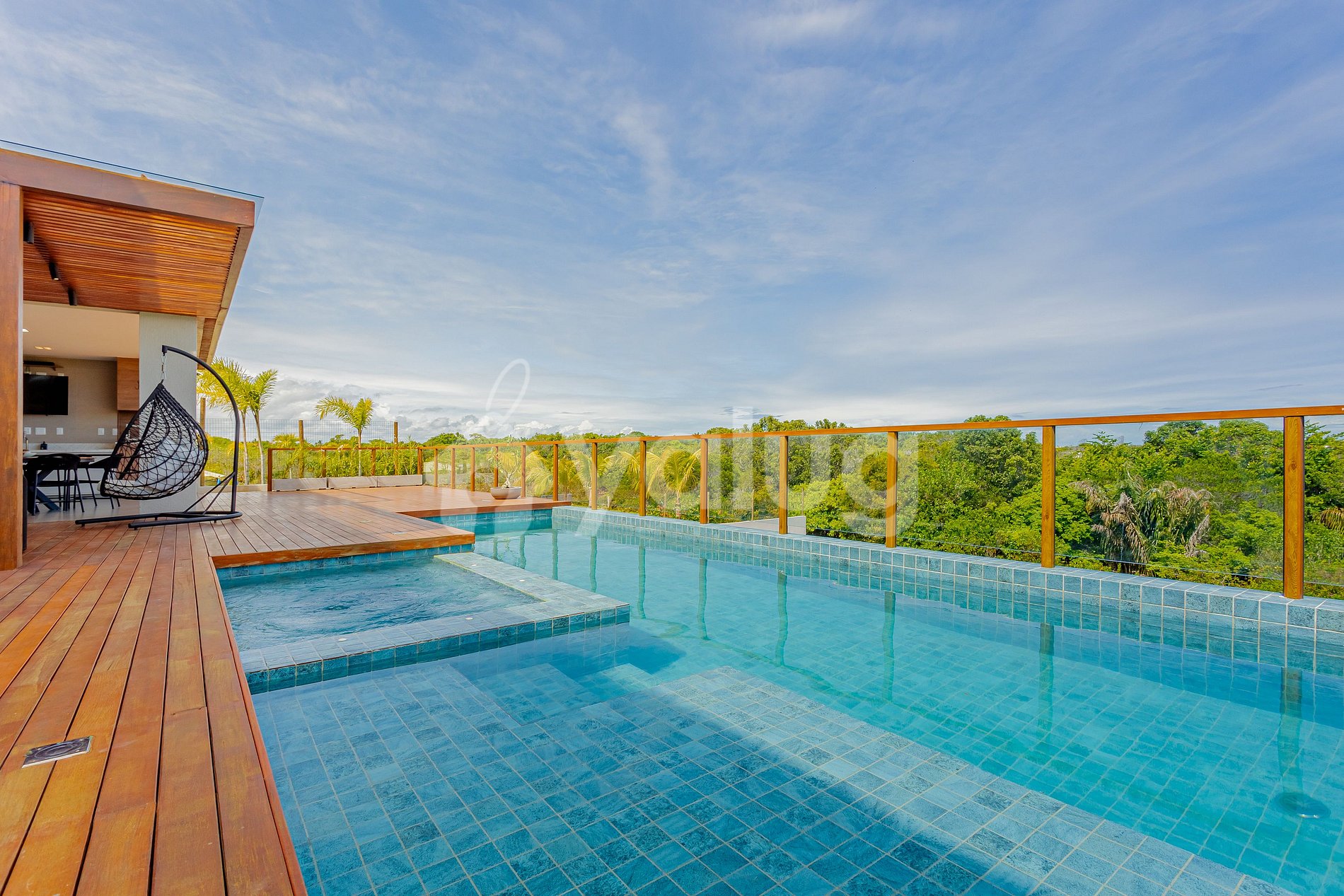 A acomodação é composta por 6 suítes, todas climatizadas, sala de estar e carregador de veículo elétrico! Além disso, área gourmet com churrasqueira, uma ótima piscina e área externa com mobília.