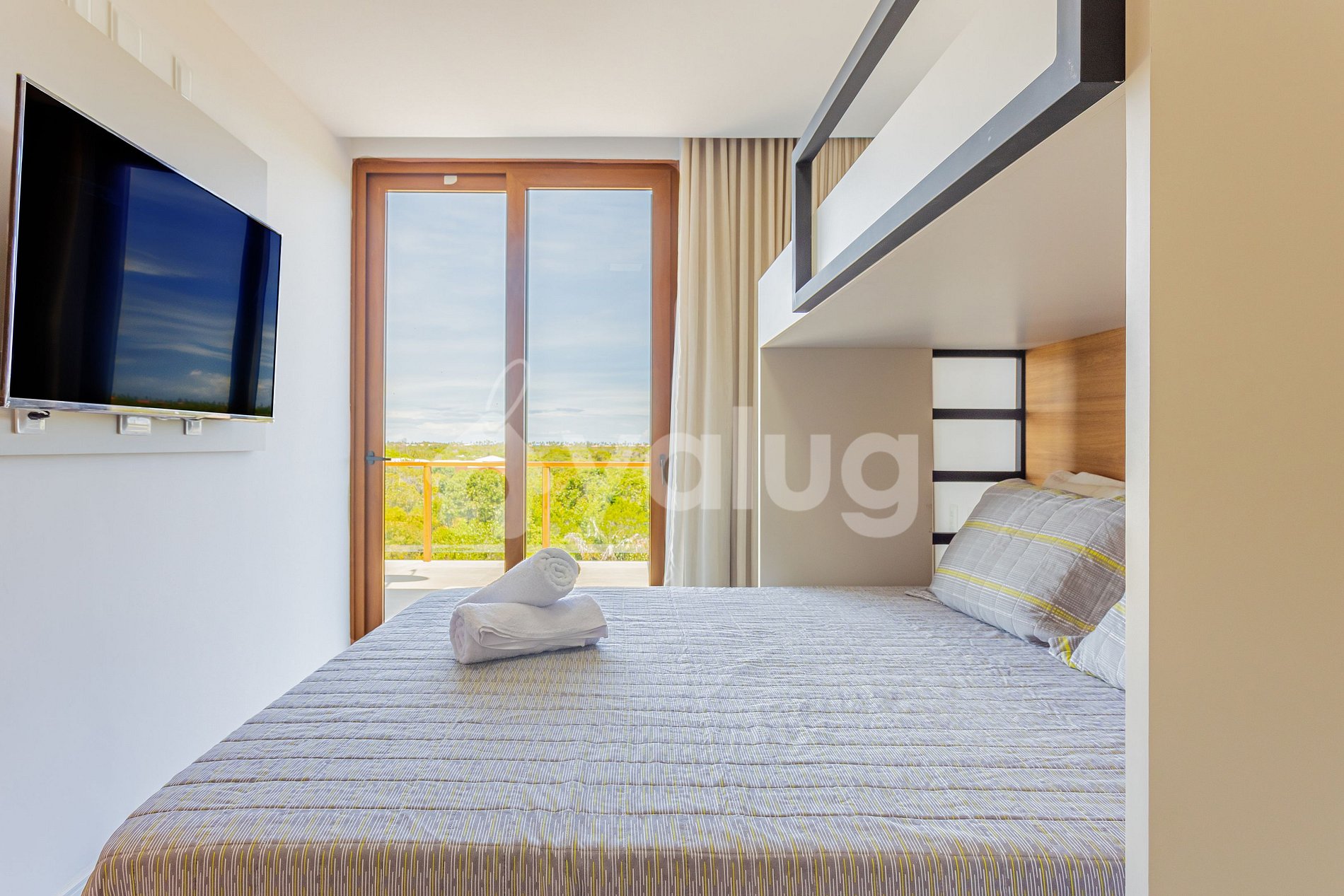 Suíte 3 (superior): 1 cama queen, 1 beliche, ar condicionado split, cortina blackout, armário, smart tv c/ canais a cabo e varanda;
