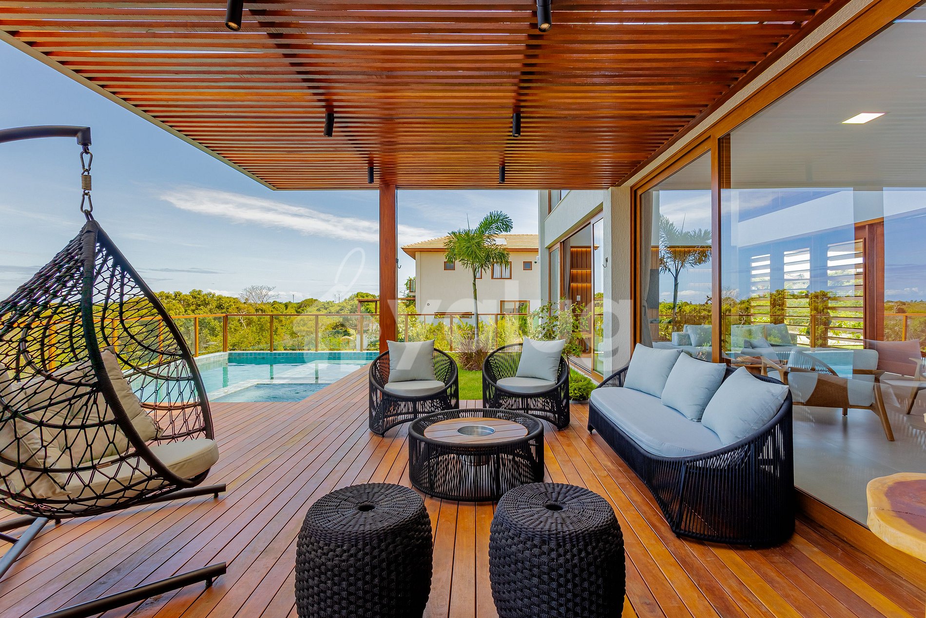 A acomodação é composta por 6 suítes, todas climatizadas, sala de estar e carregador de veículo elétrico! Além disso, área gourmet com churrasqueira, uma ótima piscina e área externa com mobília.