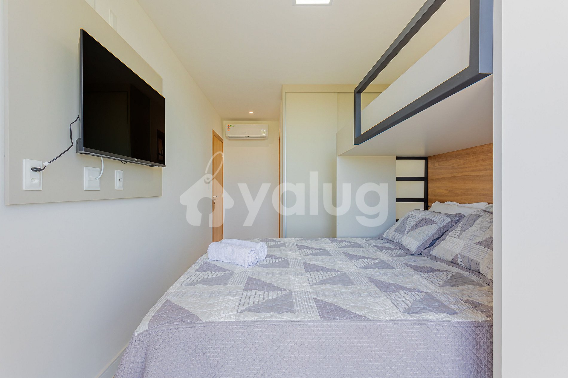 Suíte 3 (superior): 1 cama queen, 1 beliche, ar condicionado split, cortina blackout, armário, smart tv c/ canais a cabo e varanda;