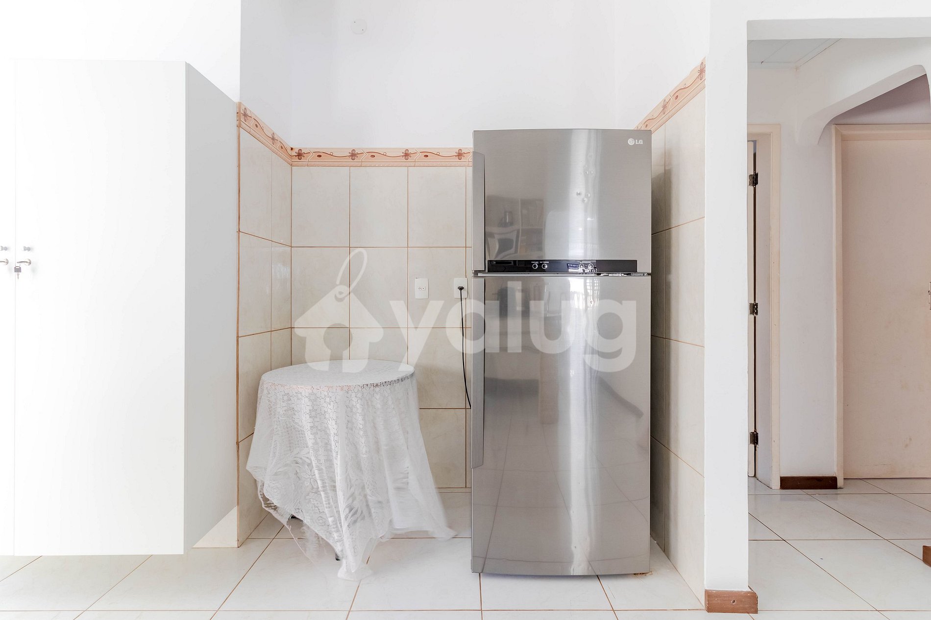 Quarto 2 (Térreo): 1 cama casal, 1 poltrona, ar condicionado tipo janela, armários, ventilador e cortina.