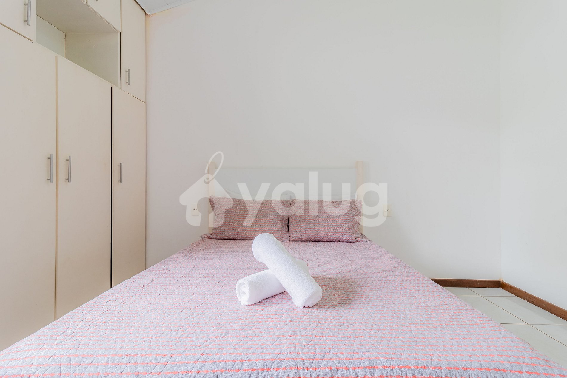 Suíte 2 (Térreo): 1 cama casal, ar condicionado tipo split, armários, ventilador e cortina.