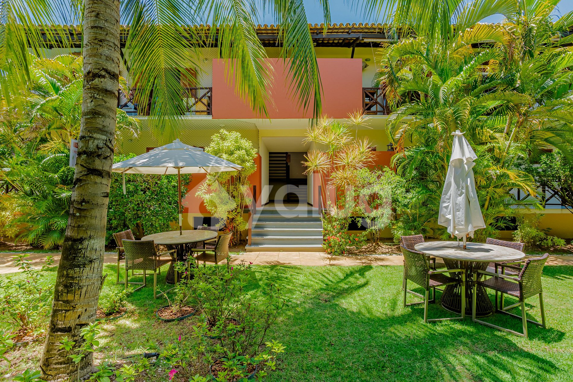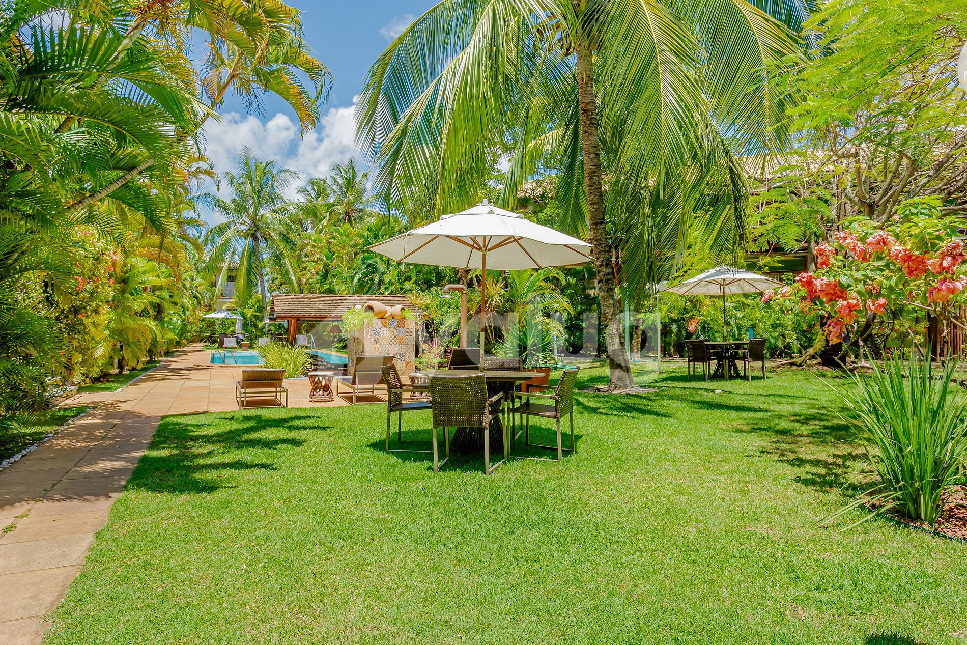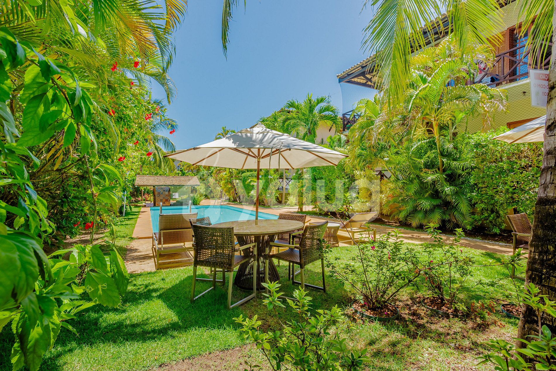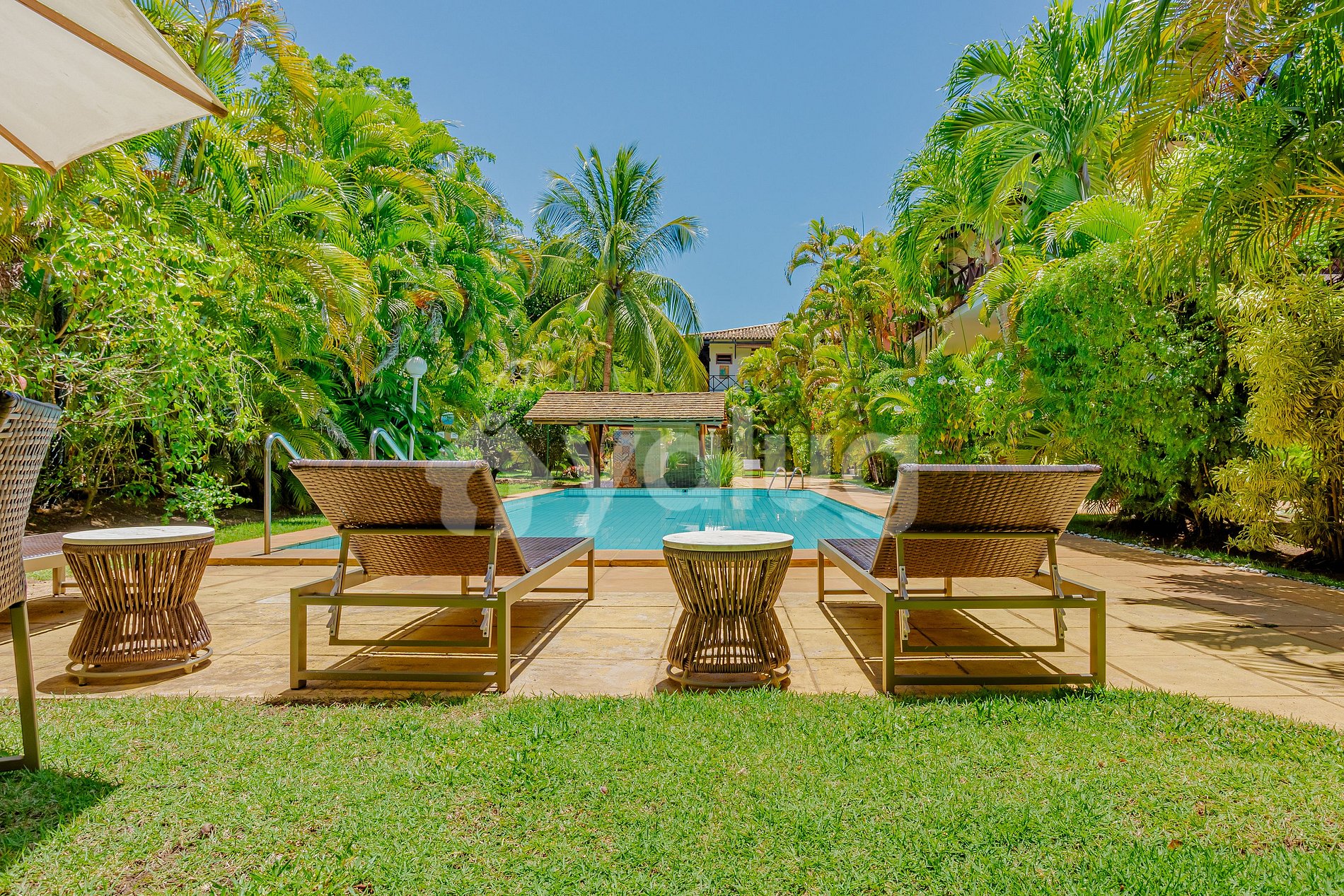 O condomínio conta com piscina e espaços ao ar livre perfeitos para relaxar após um dia de praia.
