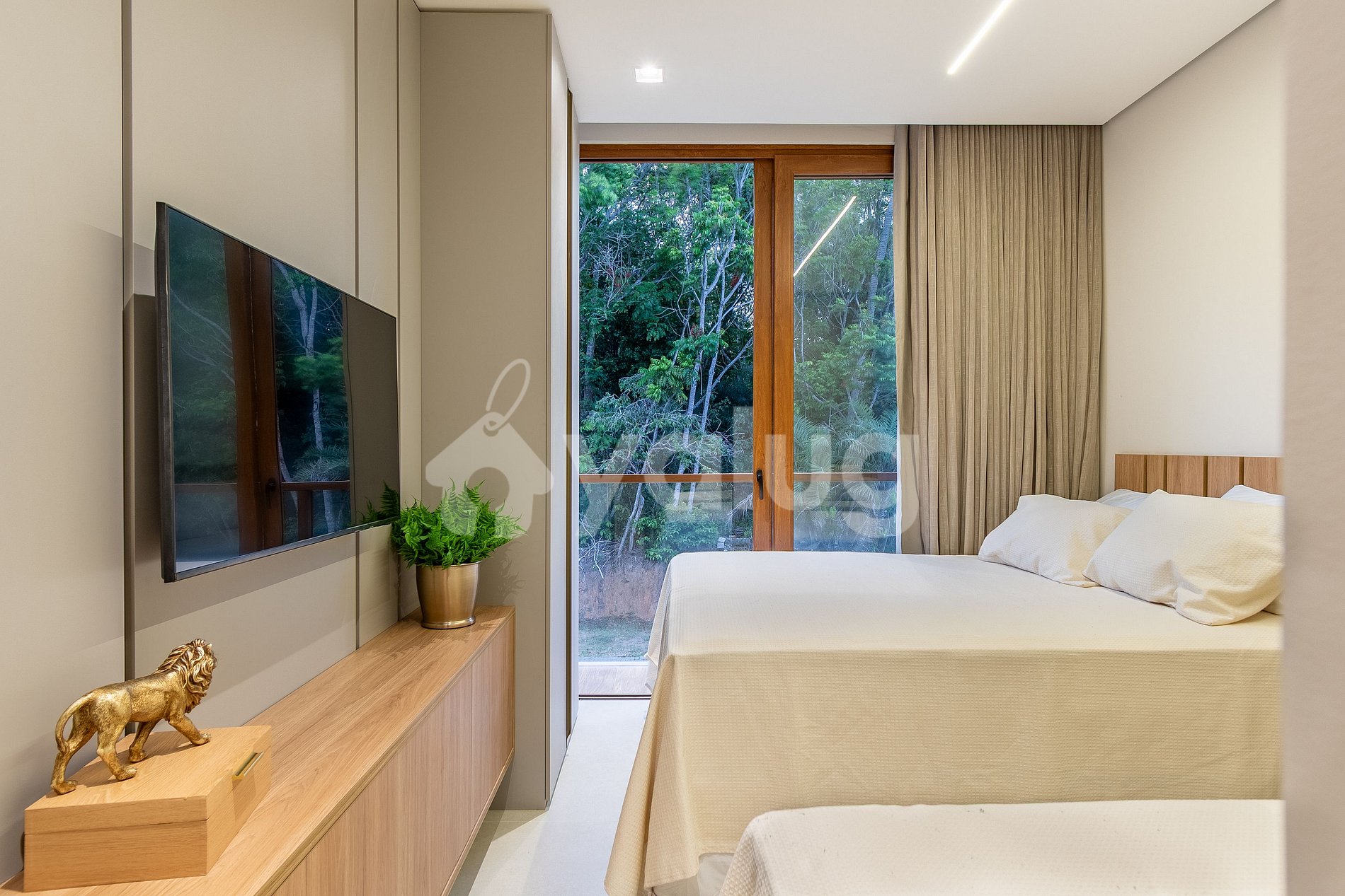Suíte 4 (superior): 1 cama queen, 1 cama solteiro, ar condicionado, smart TV, cortina, blackout, armário e acesso à varanda;