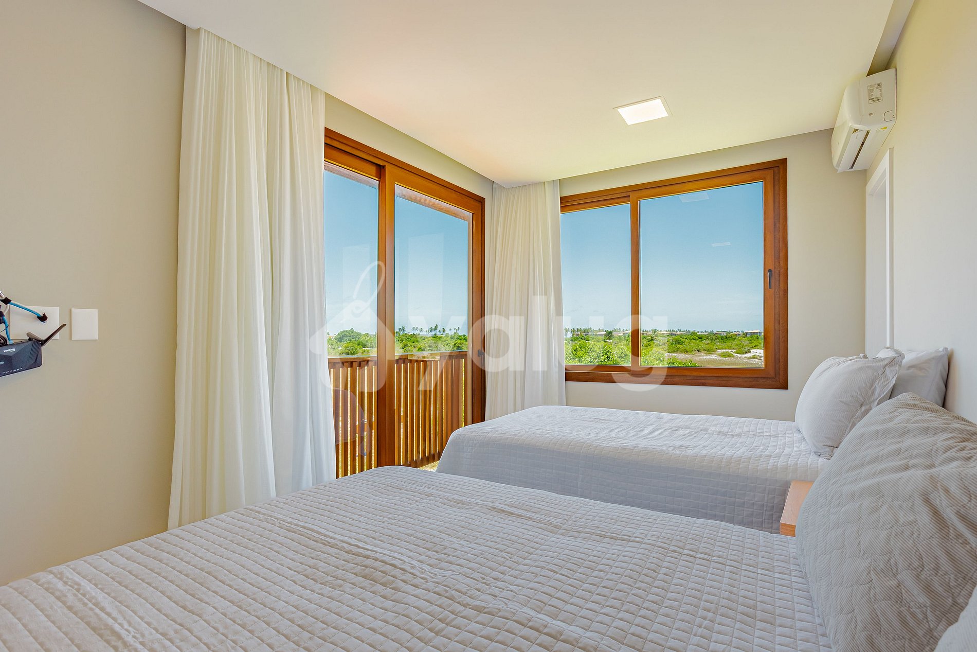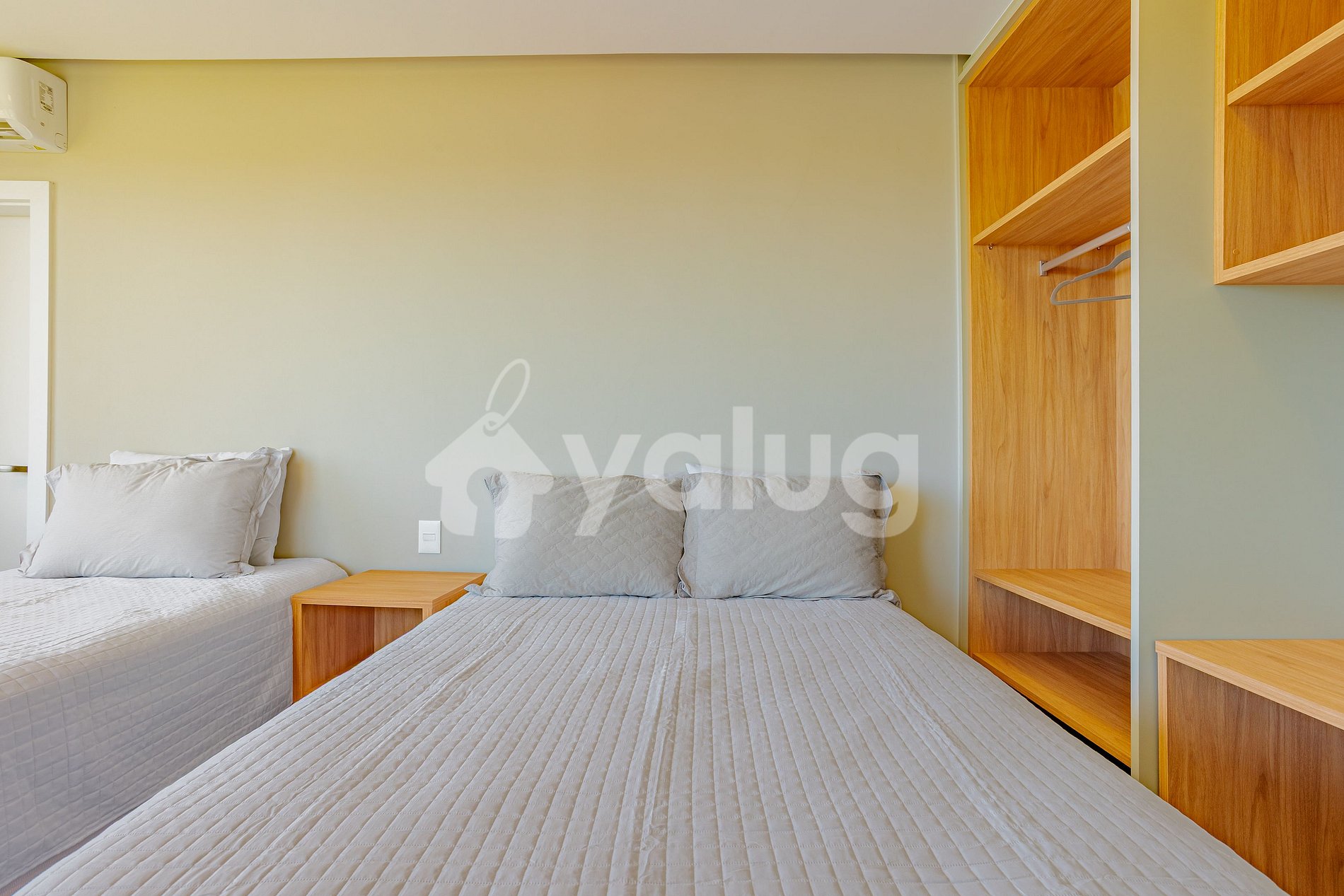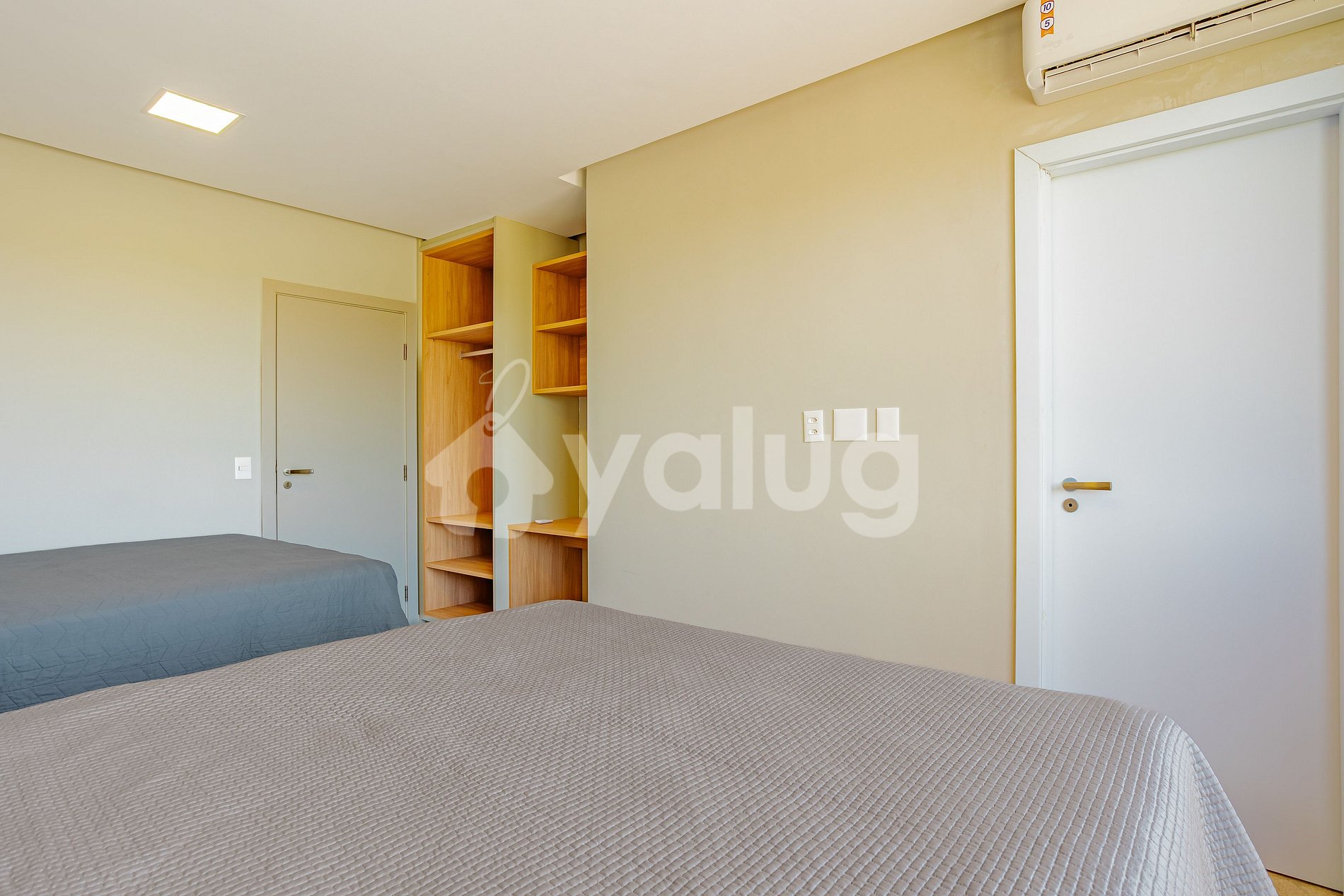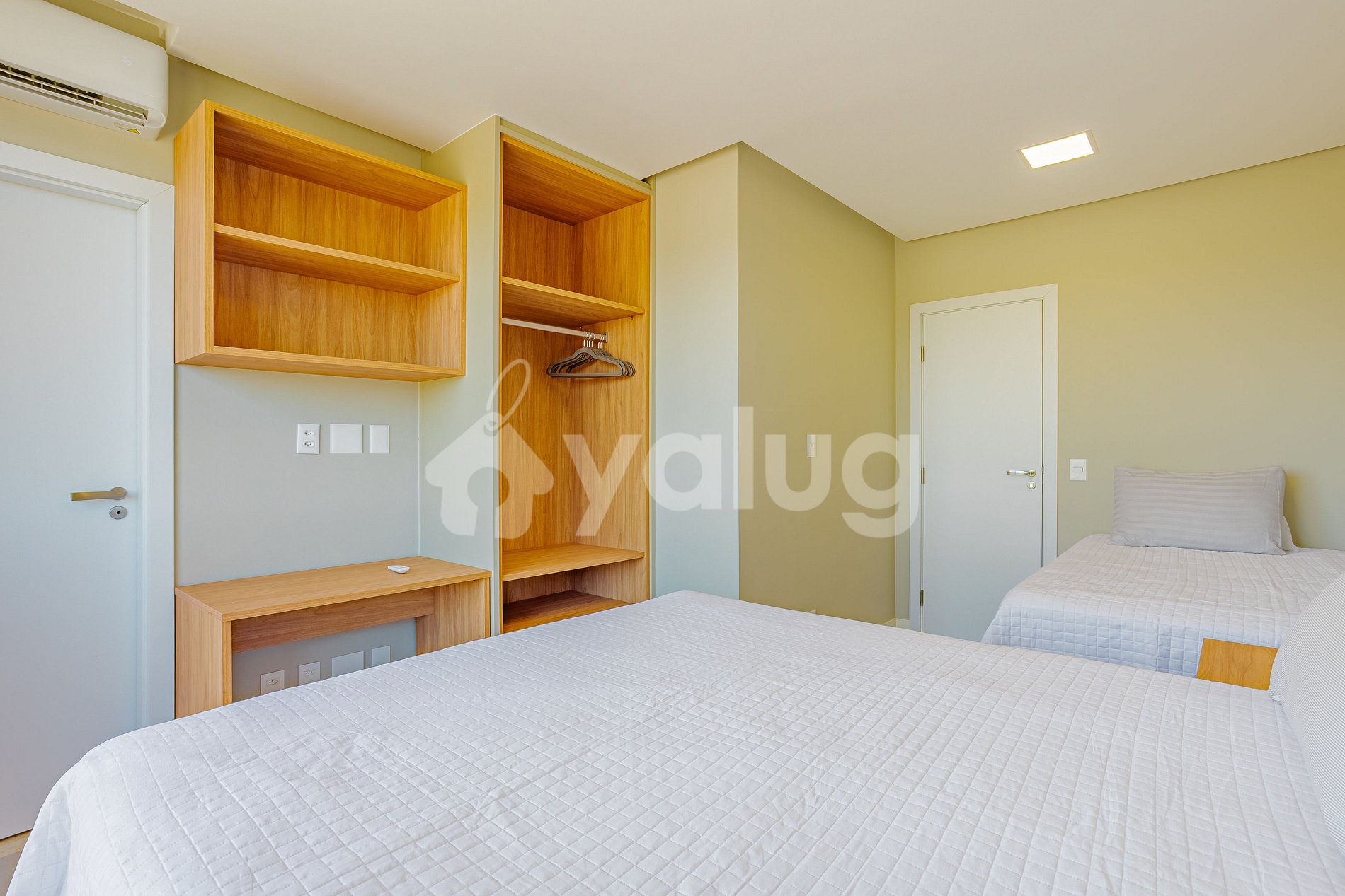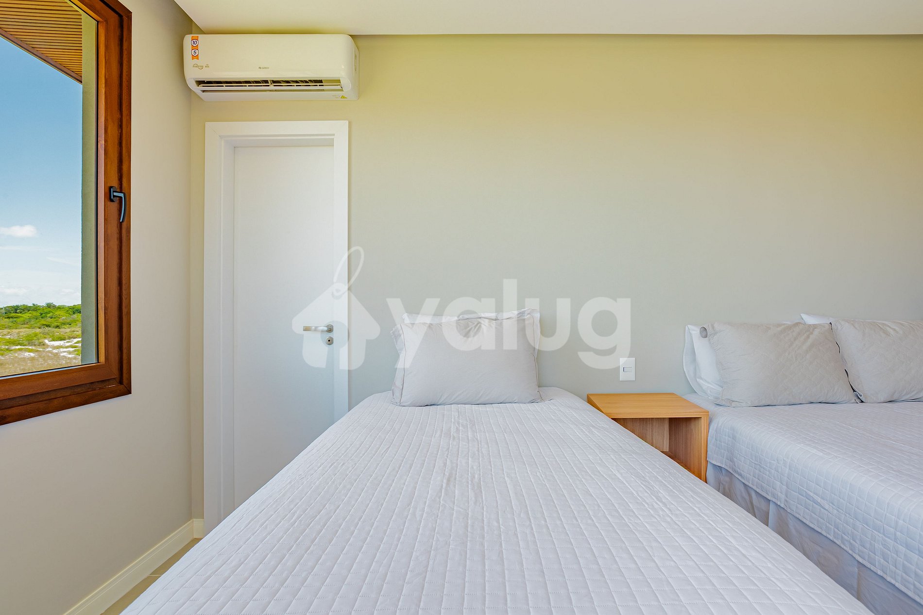 Suíte 3 (superior): 2 camas queen, ar condicionado split, cortina blackout, sacada e closet aberto;