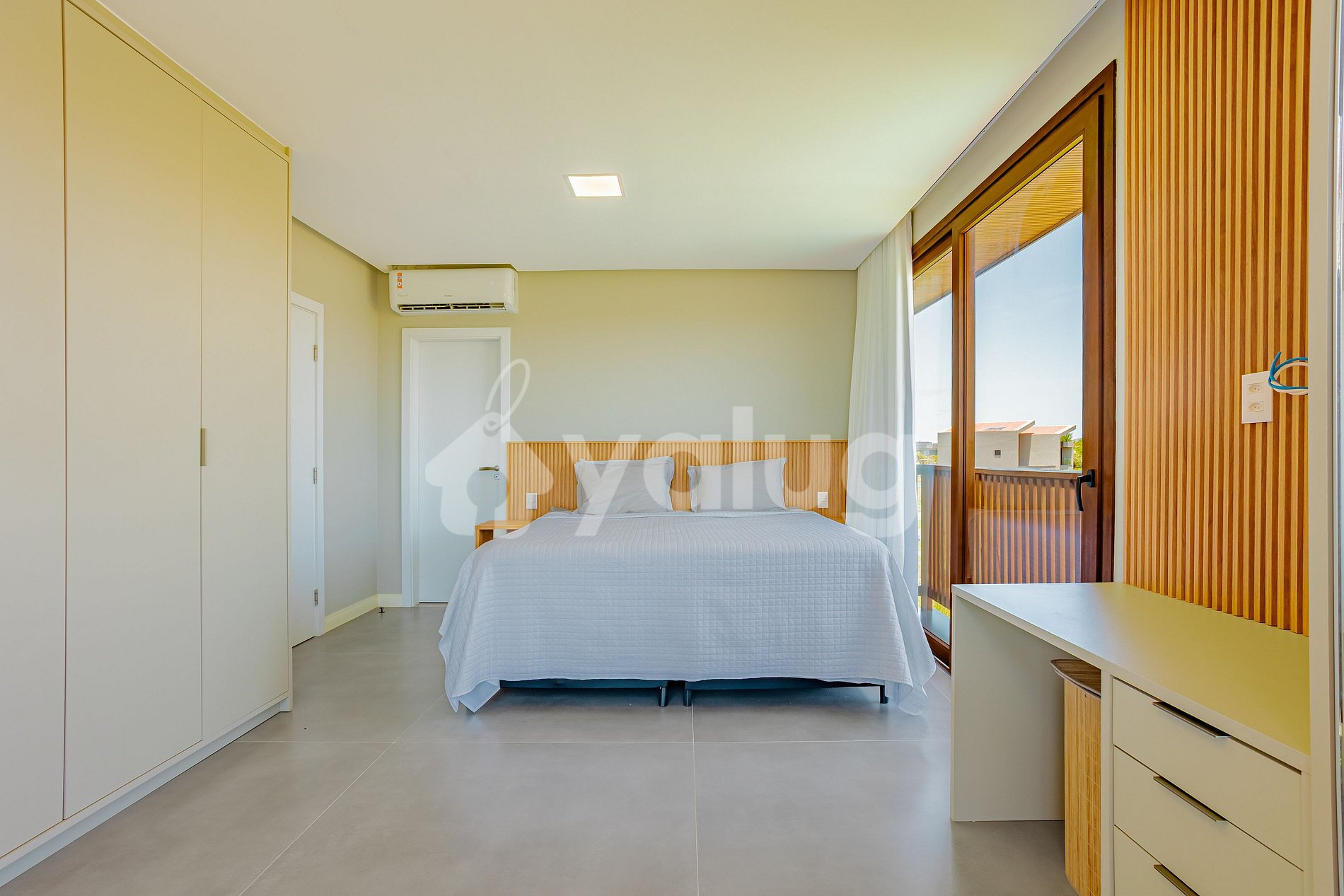 Suíte 1 (superior): 1 cama super king, ar condicionado split, cortina blackout, sacada e guarda-roupas.