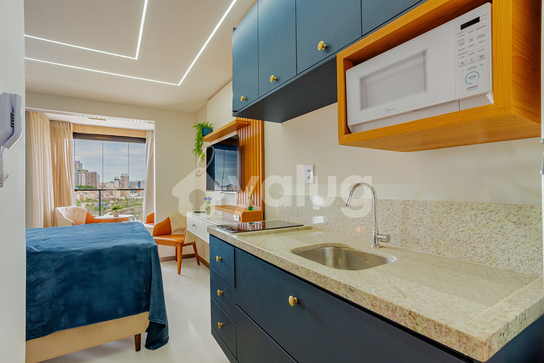 O apartamento está localizado na Pituba, é um estúdio decorado, de frente para a orla e próximo a shoppings, praias e restaurantes.
