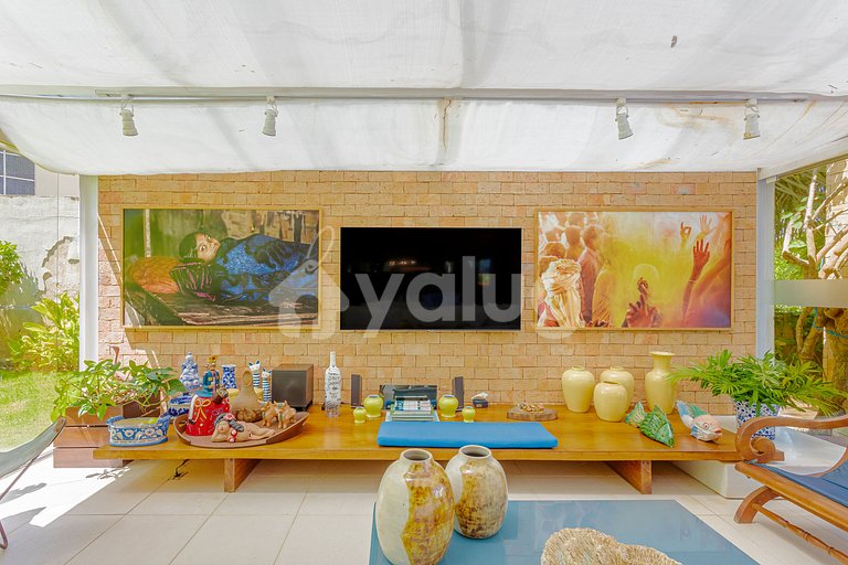 Descubra seu refúgio dos sonhos nesta casa incrível, a 300m da praia, no Condomínio Interlagos, a 20km do aeroporto de Salvador. Totalmente mobiliada, acolhedora, com 4 suítes climatizadas. Desfrute de 2 salas de TV, wi-fi, cozinha completa. Área externa com piscina, churrasqueira e verde exuberante.