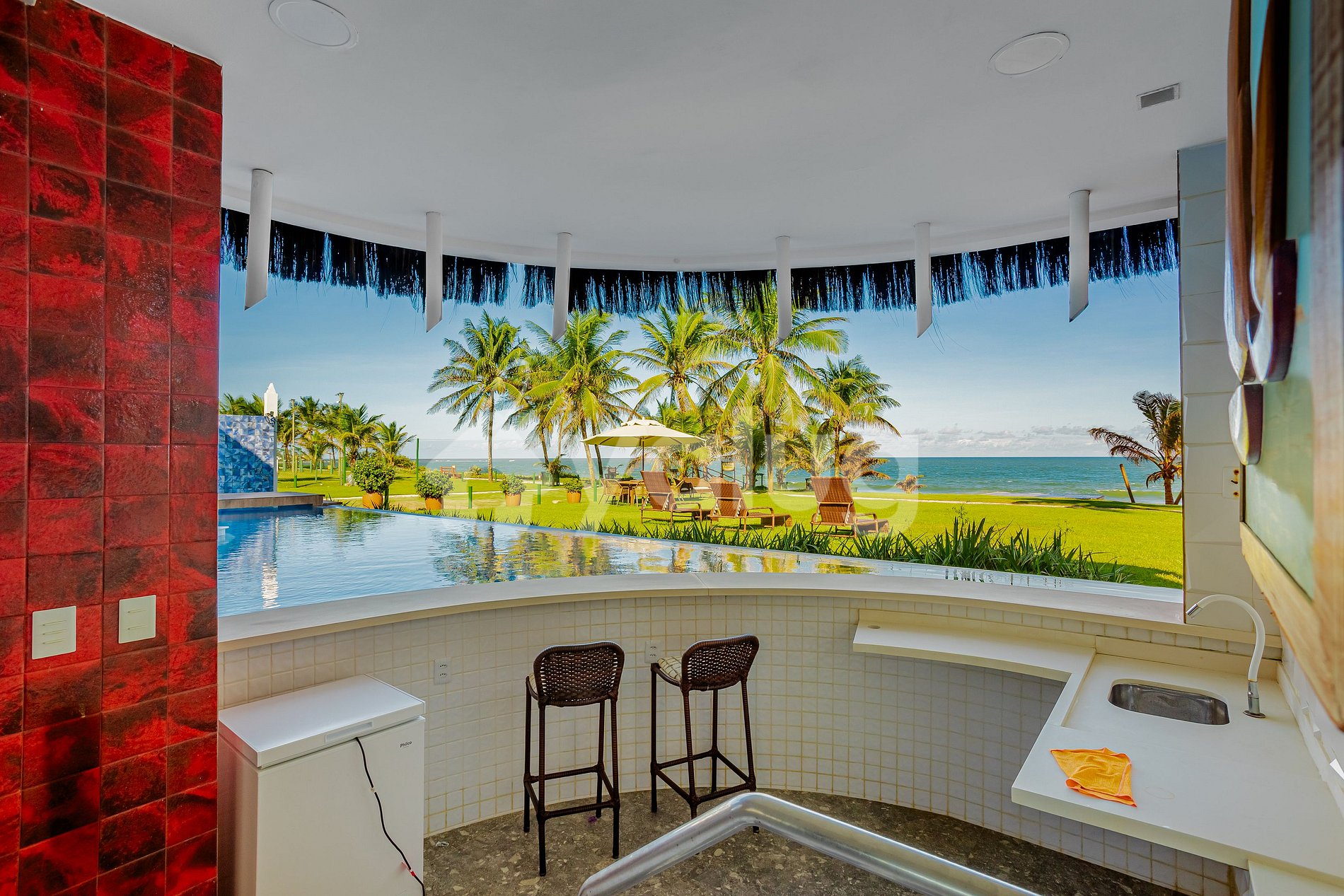 A área gourmet é espetacular! Possui piscina com borda infinita, bar molhado e vista mar; churrasqueira; ótimos móveis para relaxar e lindo jardim.
