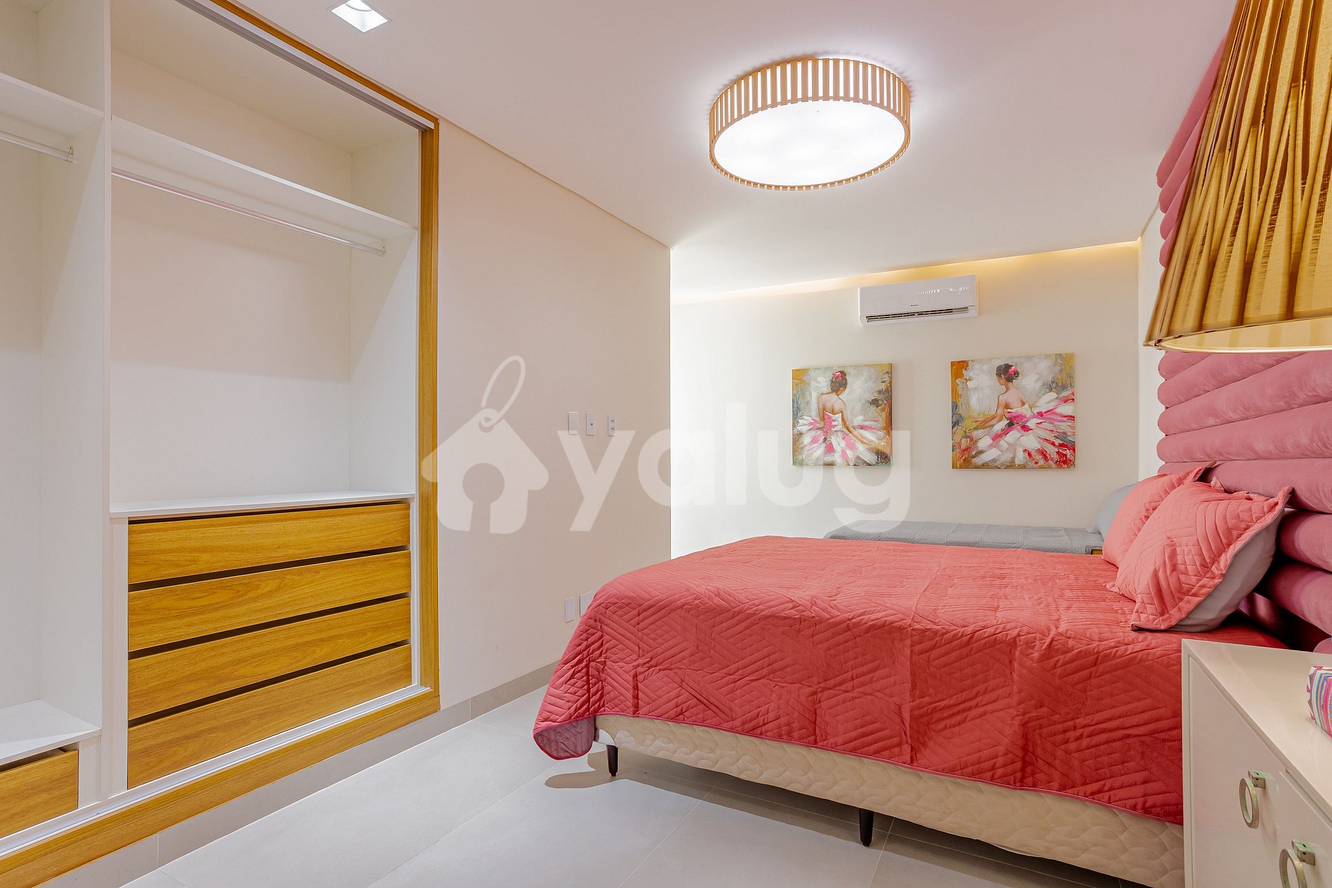 Suíte 2 (Superior): 1 cama queen, ar-condicionado, guarda-roupas e cortina black out.