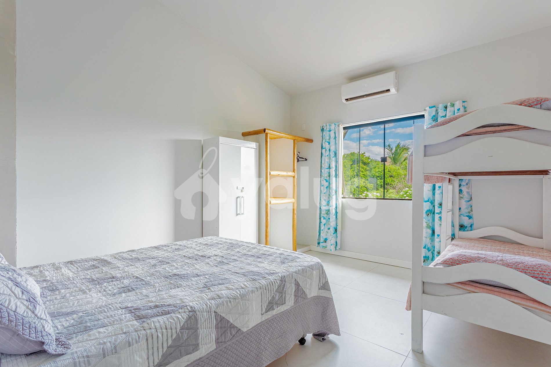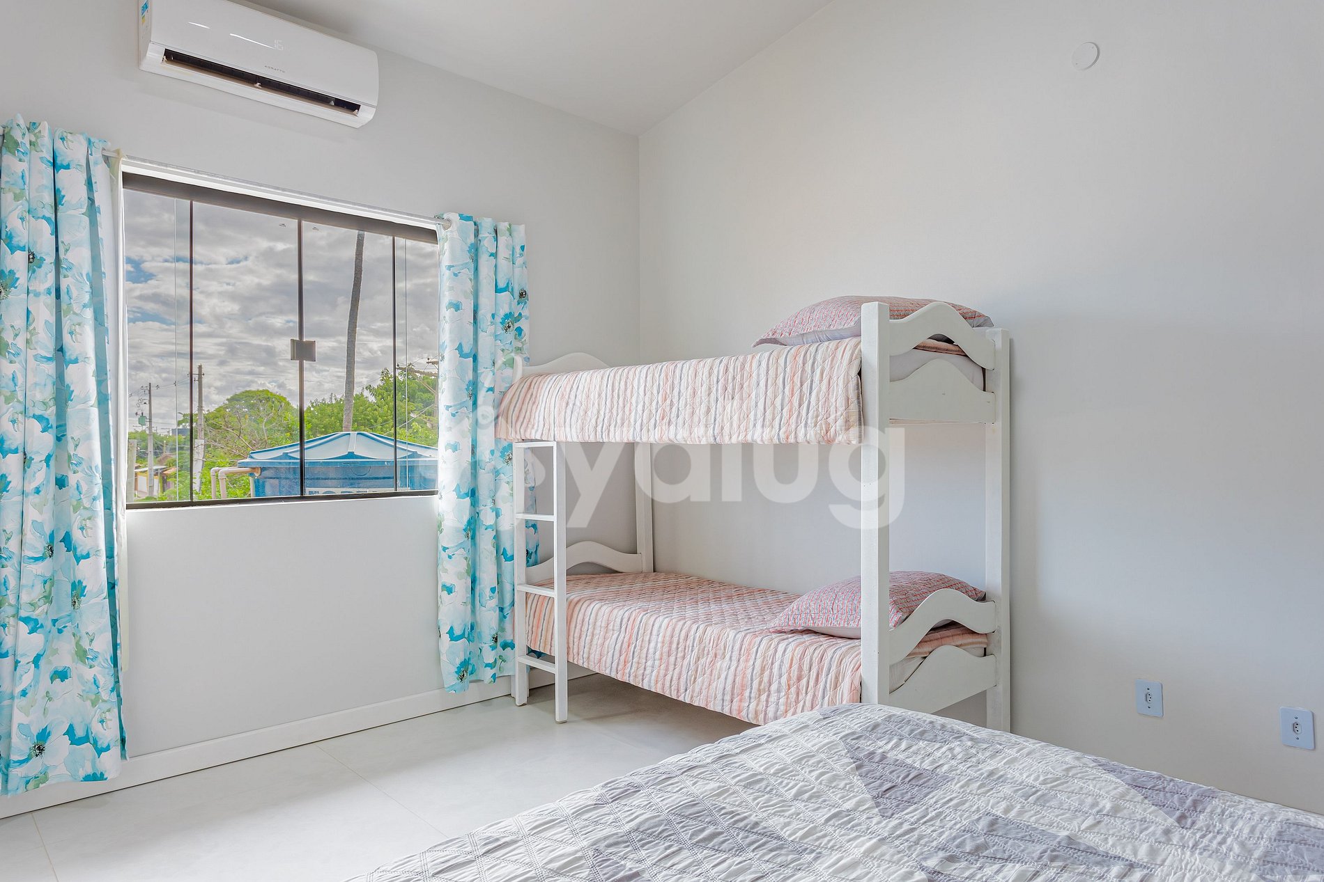 Suíte 3 (Superior): 1 cama casal, 1 beliche solteiro, ar condicionado split, cortina blackout e armário.