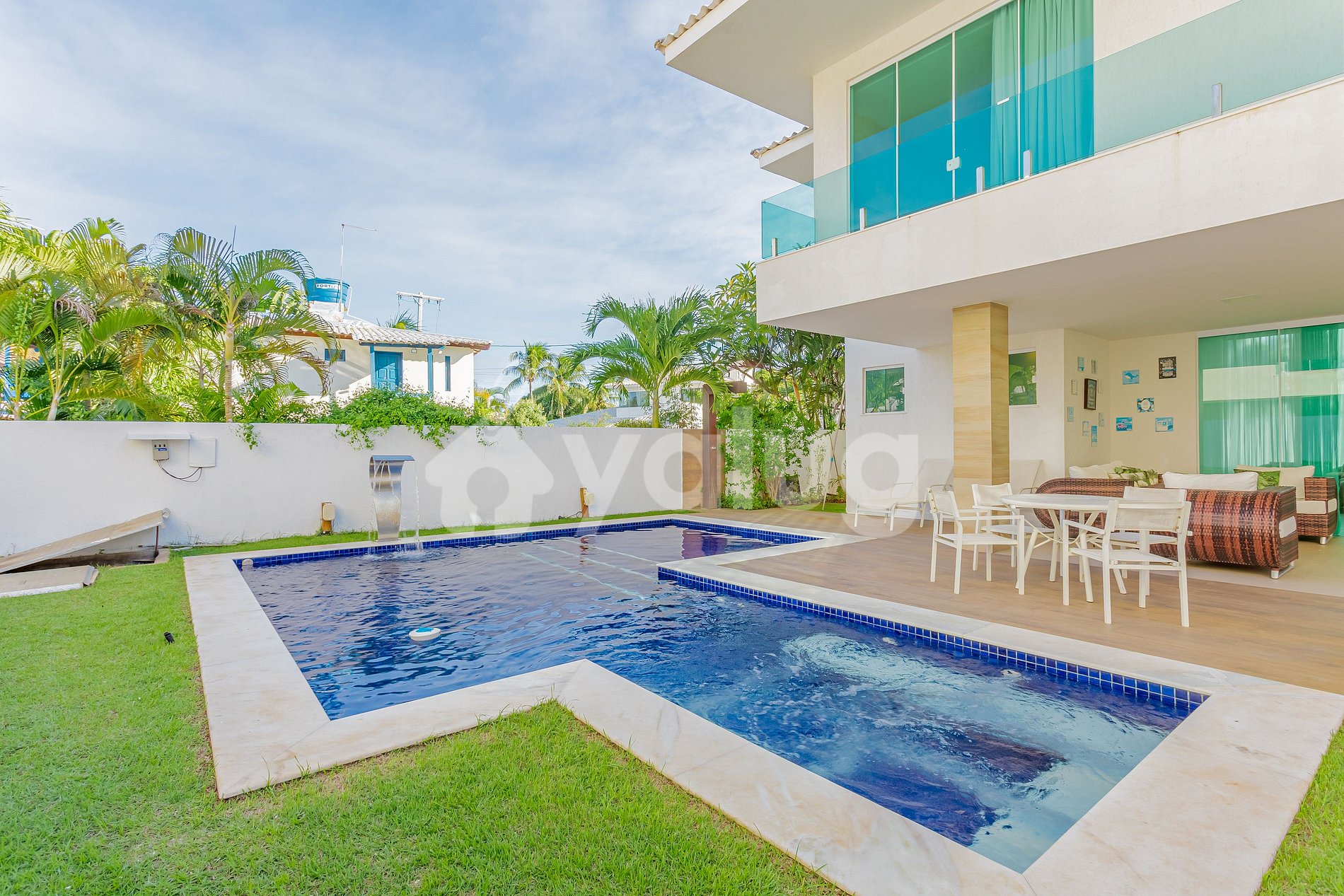 Pensando no maior conforto para os hóspedes, a casa dispõe de 7 suítes, todos climatizados, sala de estar, cozinha completa, Wi-fi e o melhor a 5 minutos da praia (350m)!