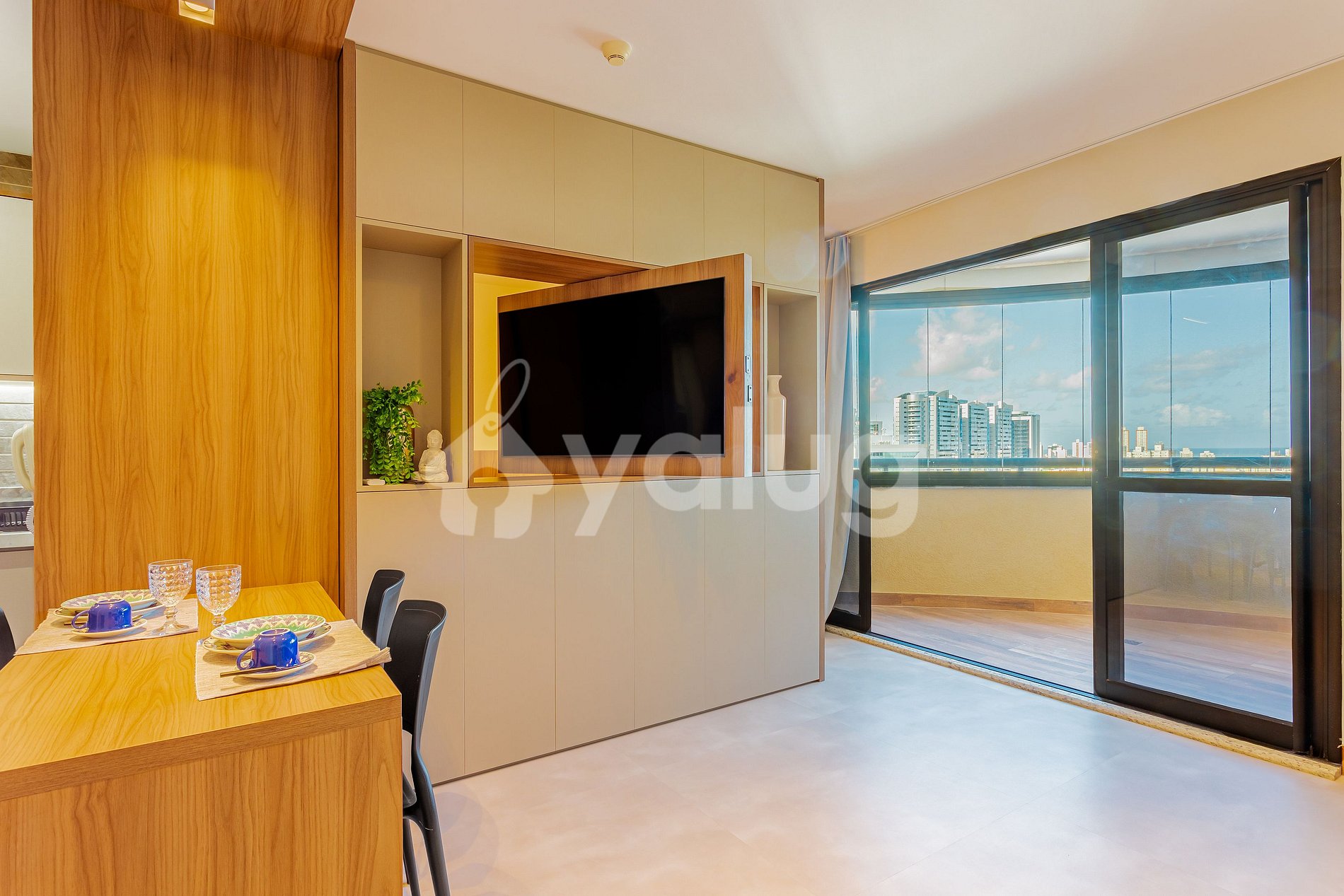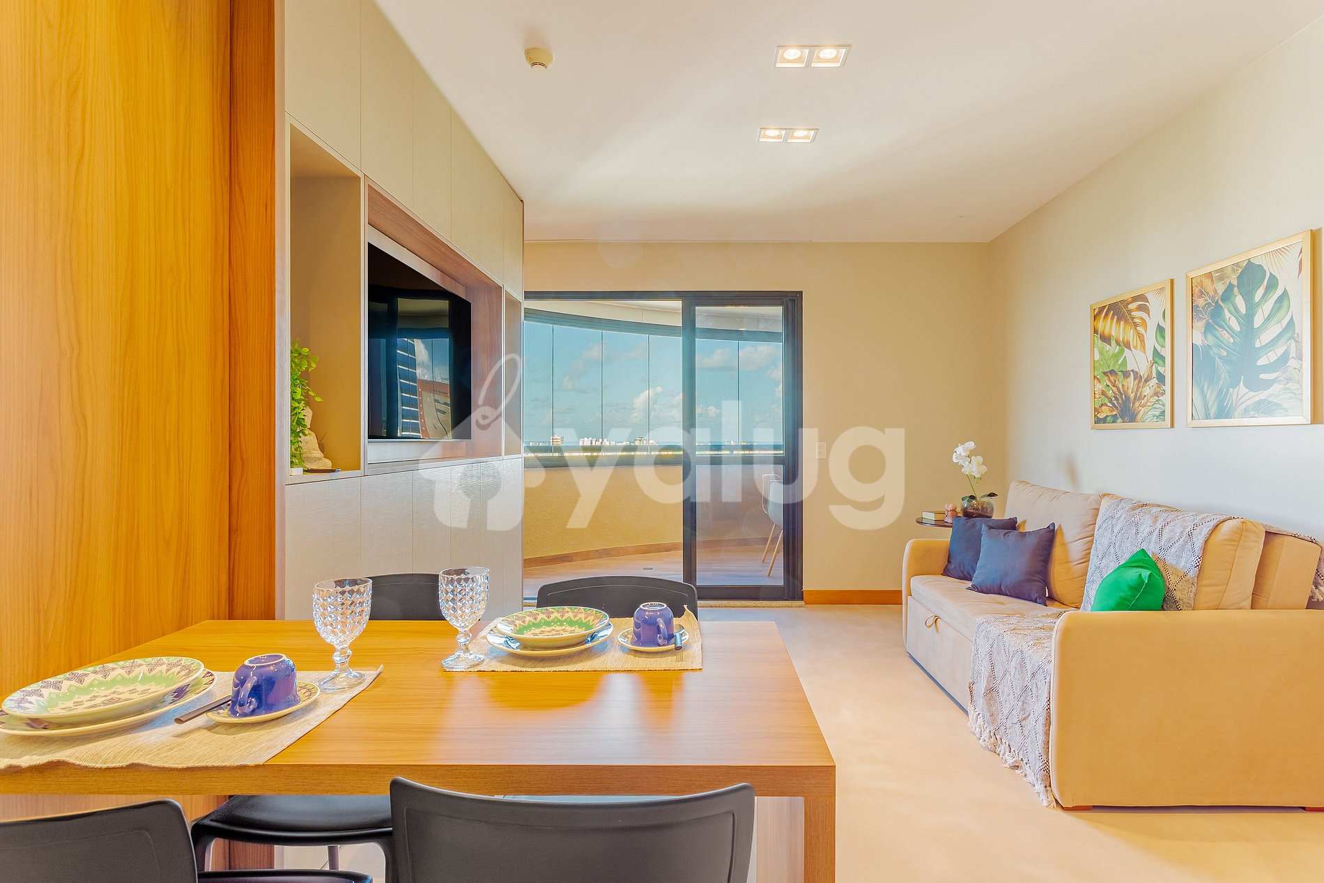Por estar localizado no 18n º andar, é possível ter a vista da cidade e do mar. O imóvel dispõe de 1 quarto com cama casal, ar condicionado Split, sala com sofá cama e acesso a vista, uma cozinha de apoio com todos utensílios necessários para sua estadia.
