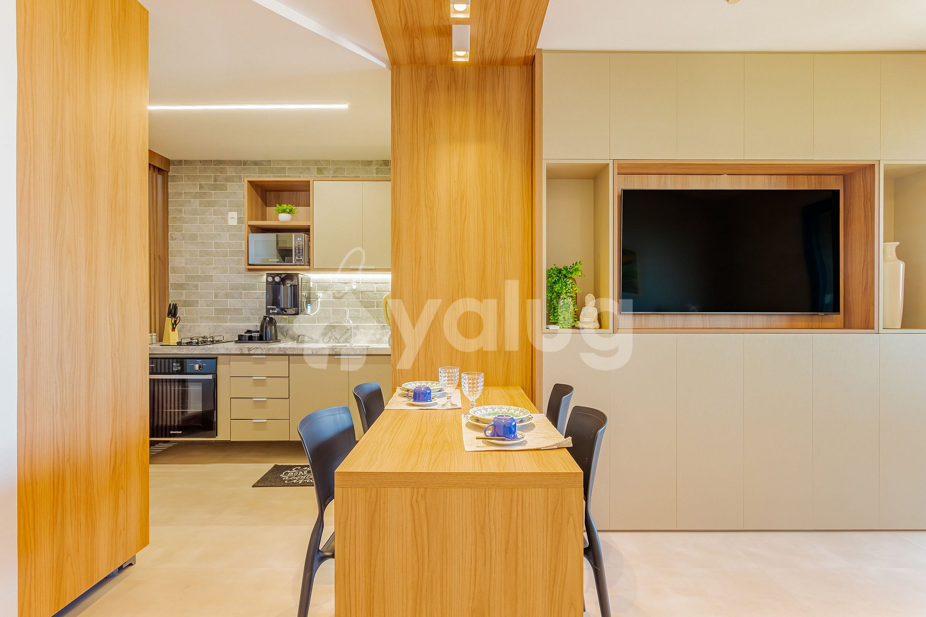 Sala: Sofá cama, Tv conjugada articulada com o quarto e mesa de jantar.