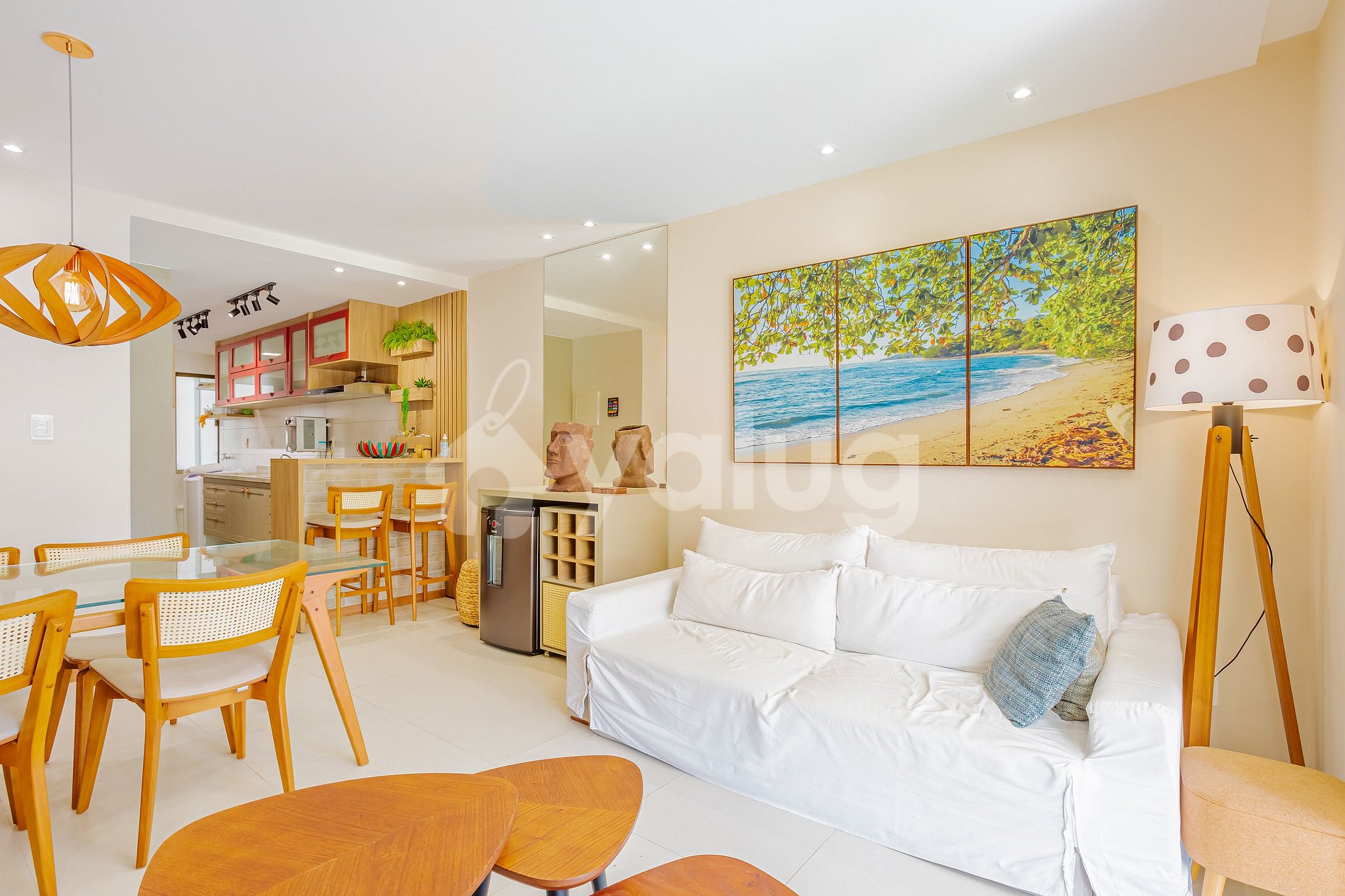 O apartamento dispõe sala de estar decorada e com cervejeira, possui 3 suítes todas climatizadas, mobiliadas e decoradas, cozinha super completa para sua estadia, área gourmet mobiliada e com itens para uso na praia ou piscina.