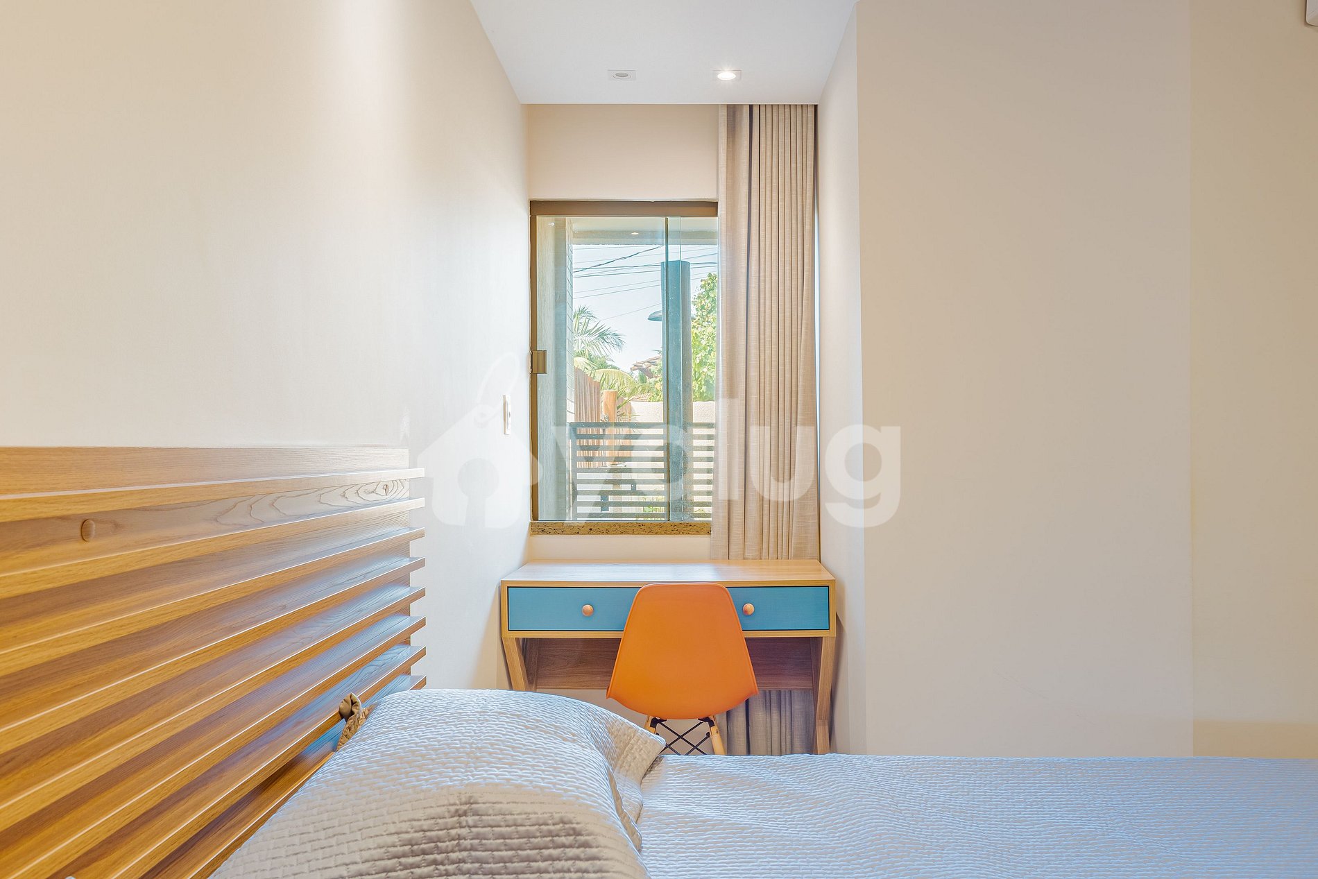 Suíte 2: ar-condicionado split, cortina blackout, armários, 1 cama queen, 1 abajur.
