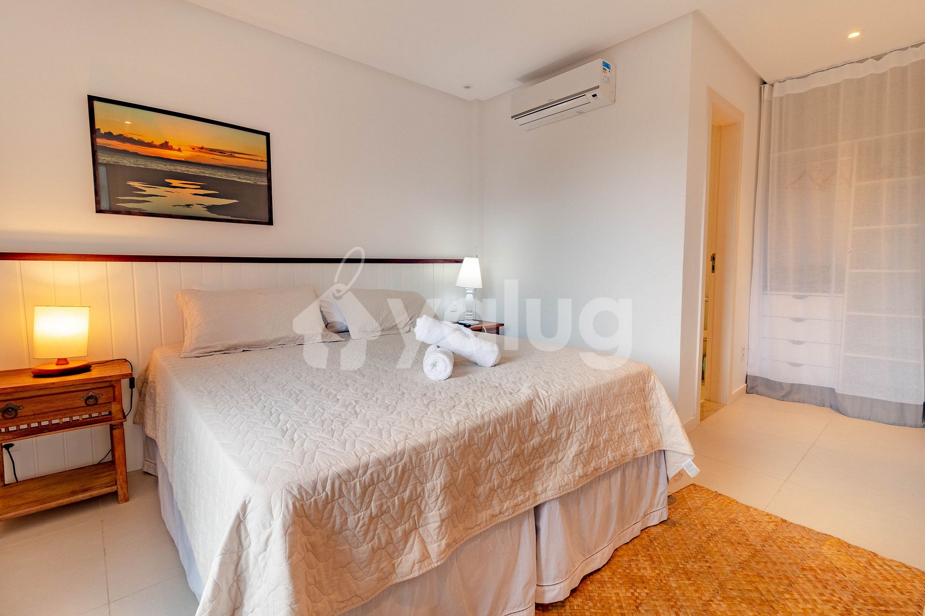 Suíte 1: 1 cama casal, ar condicionado split, tv, blackout e varanda.