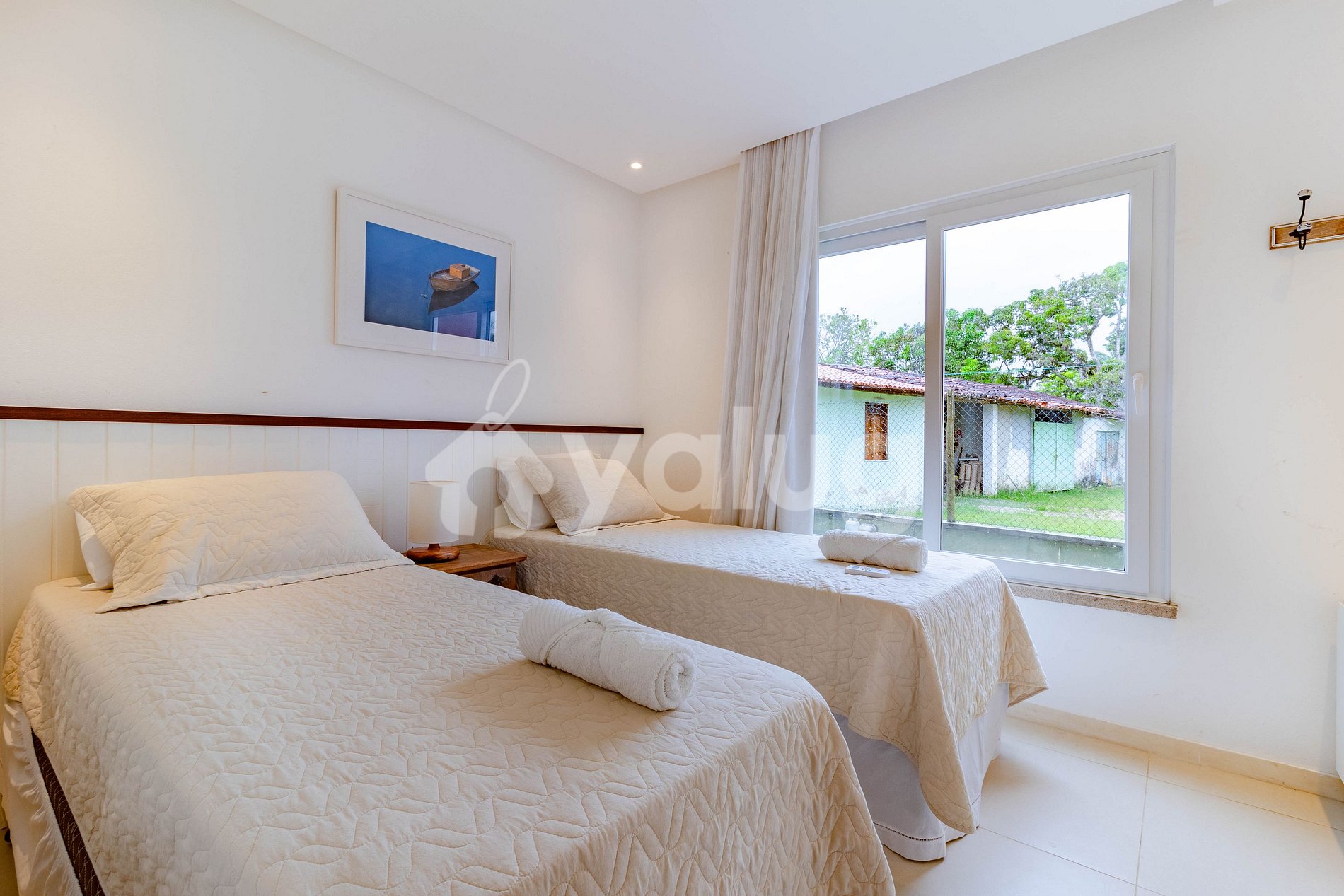 Quarto 1: 2 camas solteiro, ar condicionado split e cortina blackout.