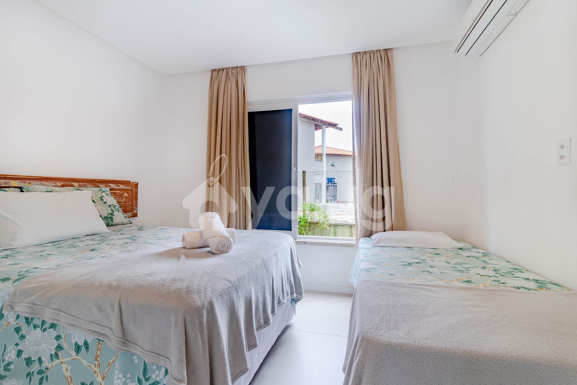 Quarto 1: 1 cama casal, 1 cama solteiro, ar condicionado split e cortina blackout.