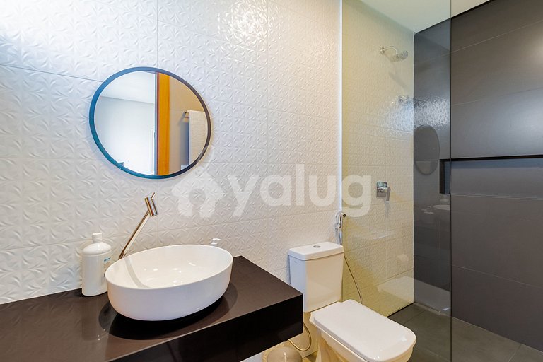 Acomoda até 8 pessoas e conta com 4 quartos (3 suítes, sendo uma no andar térreo), sala de estar aconchegante com Smart Tv e cozinha completa, integrados e com acesso direto à área externa, com piscina, jardim e churrasqueira.